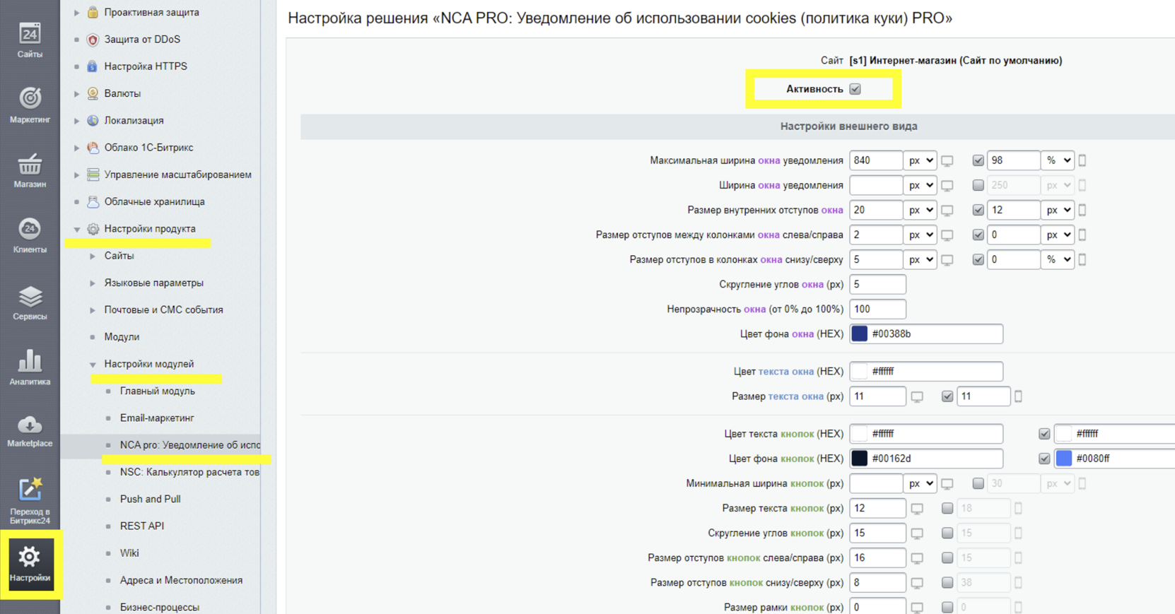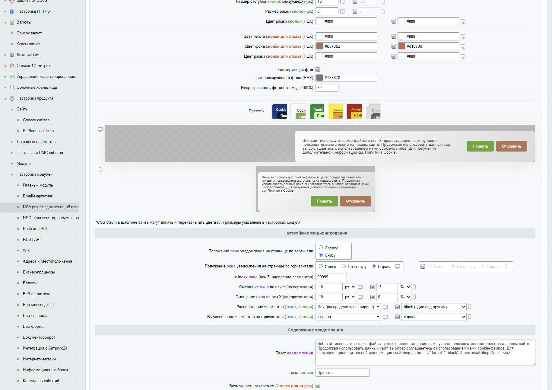 В настройках можно задать цвет, изменить текст и несколько других параметров. Поддержка многосайтовости.