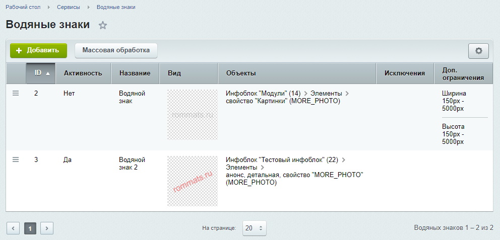 • Сайт. Если картинка используется на нескольких сайтах, можно отметить только те из них, на которых должен выводится водяной знак.