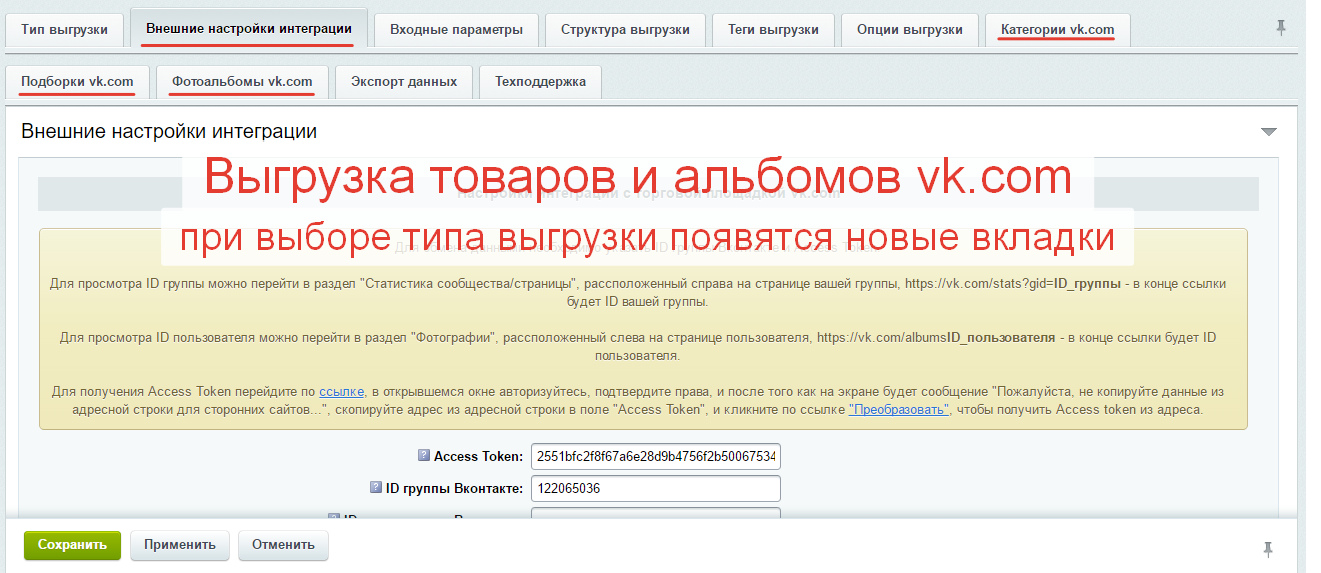 | Режим выгрузки НЕ выгружать товары, имеющие торговые предложения | | | | |