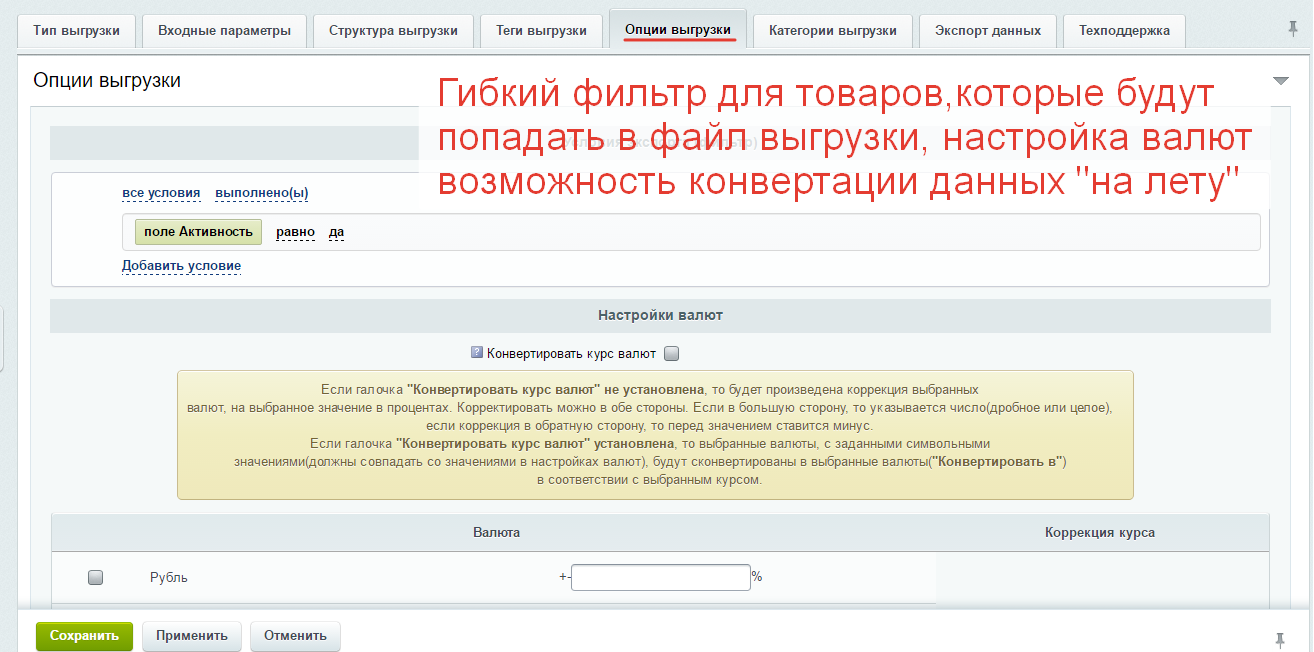 | Опция применения Фильтров и группы фильтров для исключения из фида данных товаров по условиям выгрузки | | | | |