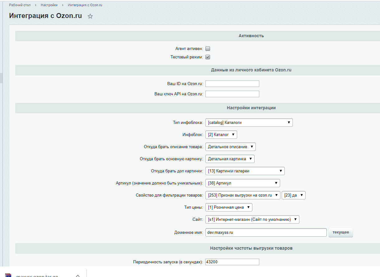 ВНИМАНИЕ! Основная задача модуля обеспечить автоматическую выгрузку на маркетплэйс ozon.ru остатков и цен товаров, а также загрузку заказов по схеме fbs и dbs. 100%-но корректная выгрузка информации по товарам (описания, картинки, свойства, бренды) в некоторых случаях не гарантирована из-за особенностей API озона.