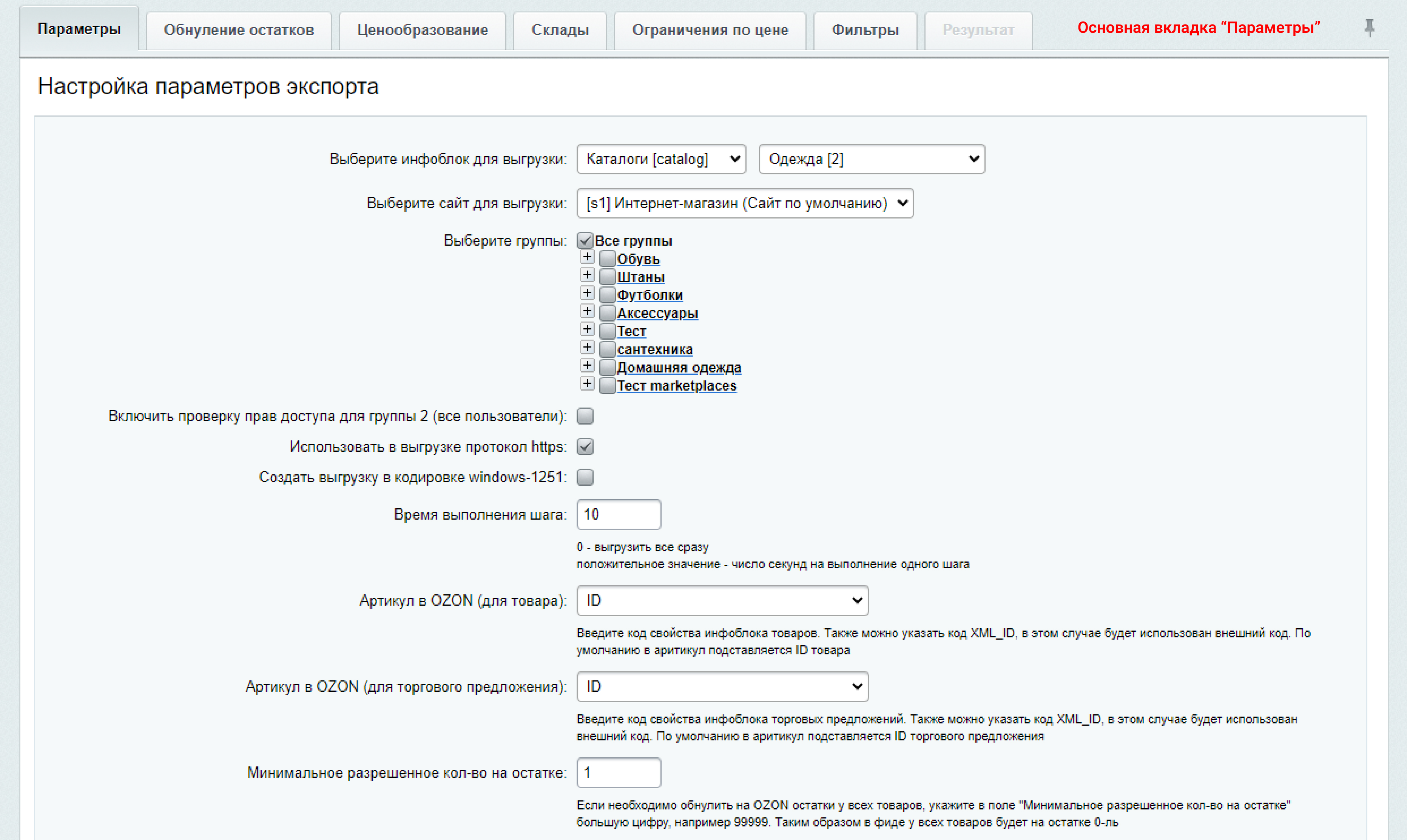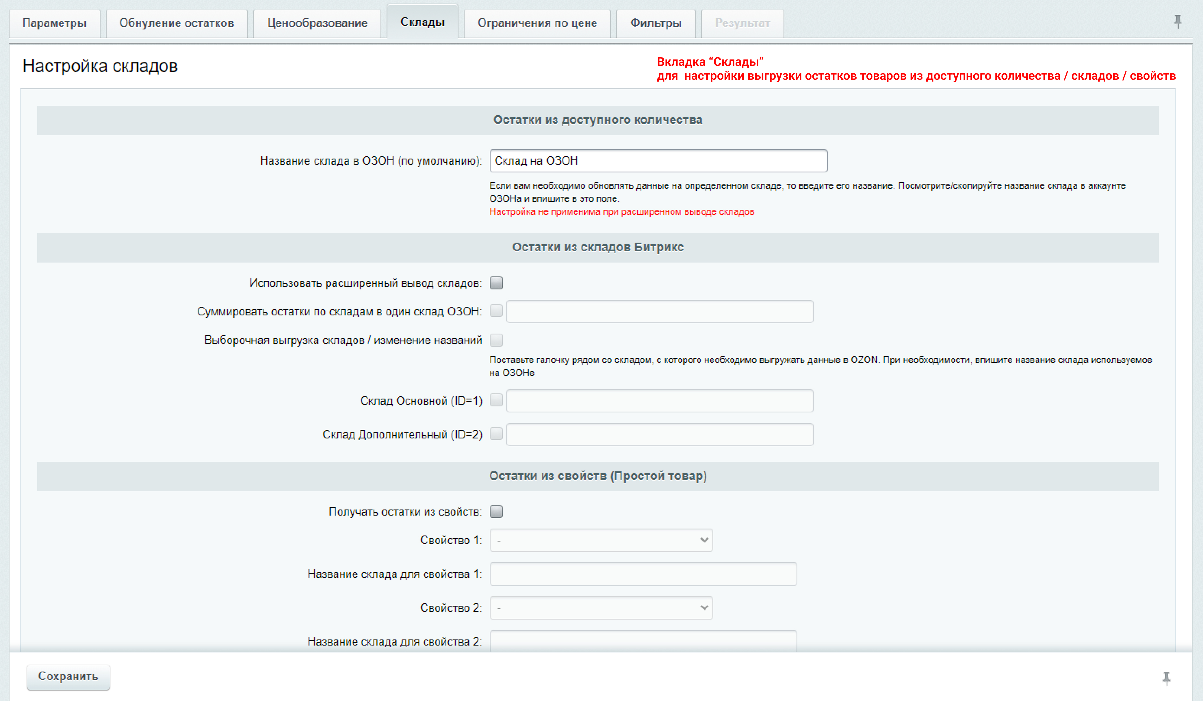 - Если в Битрикс только один склад, то можно указать название склада по умолчанию на ОЗОН в отдельном поле настроек модуля (упрощенный режим вывода остатков).