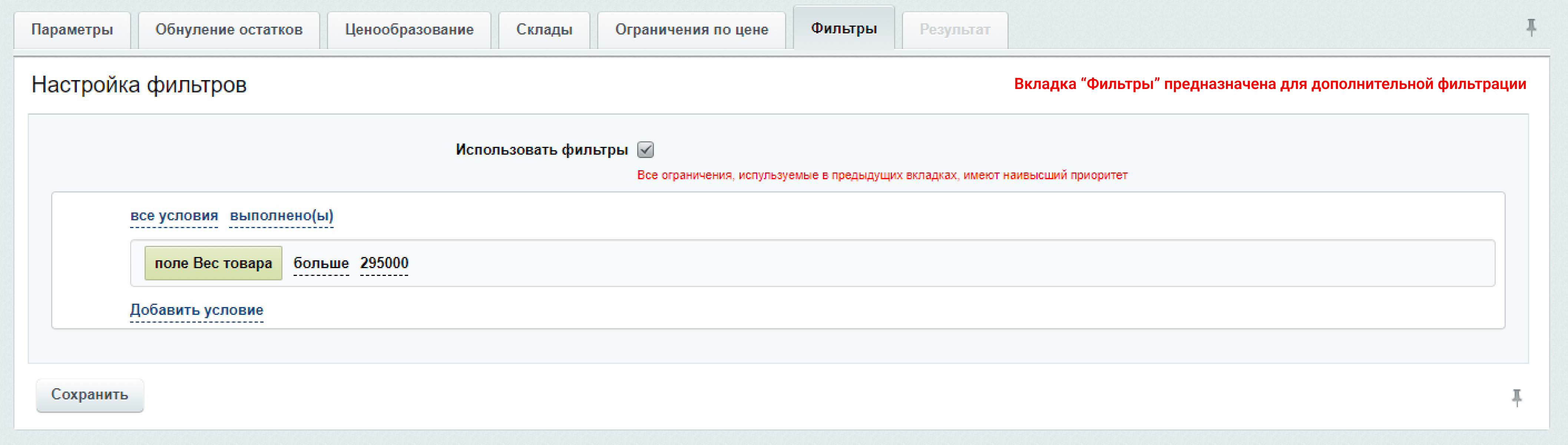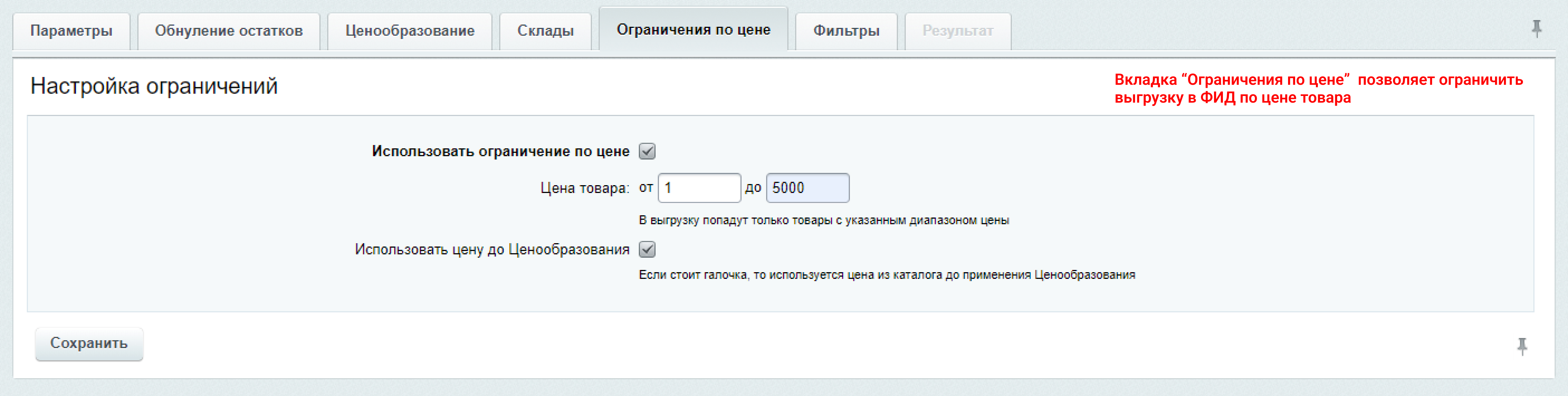 - Ограничение выгрузки по цене товара. Важно учесть, что за основу для фильтрации может быть использована цена до ценообразования или после ценообразования. Ограничение выгрузки по цене может потребоваться, если применяется различное ценообразование в разном ценовом диапазоне товара. А так же другие уникальные варианты под ваши нужды.