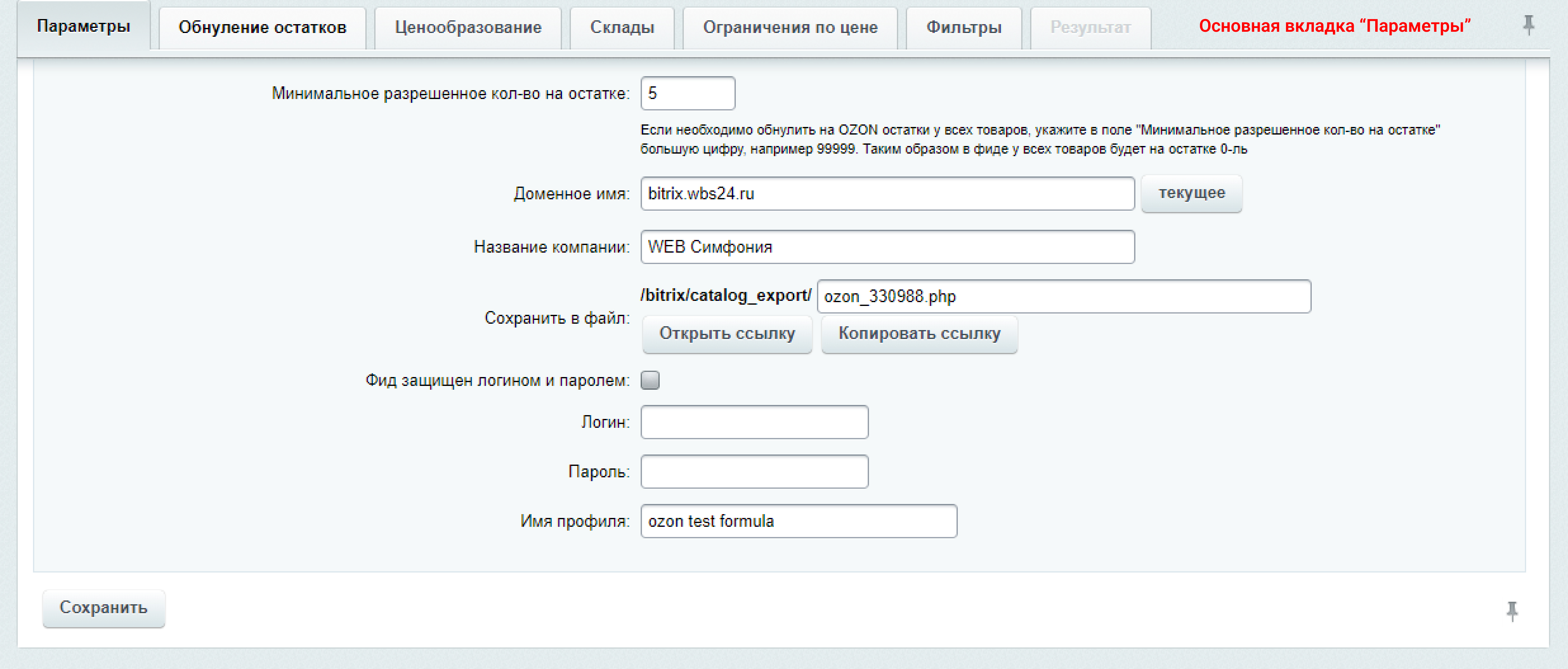- Возможность использование пароля для фида. Скопируйте настройки логина и пароля из личного кабинета OZON в профиль экспорта и активируйте галку «Фид защищен логином и паролем». После этого доступ к фиду будет защищен.
