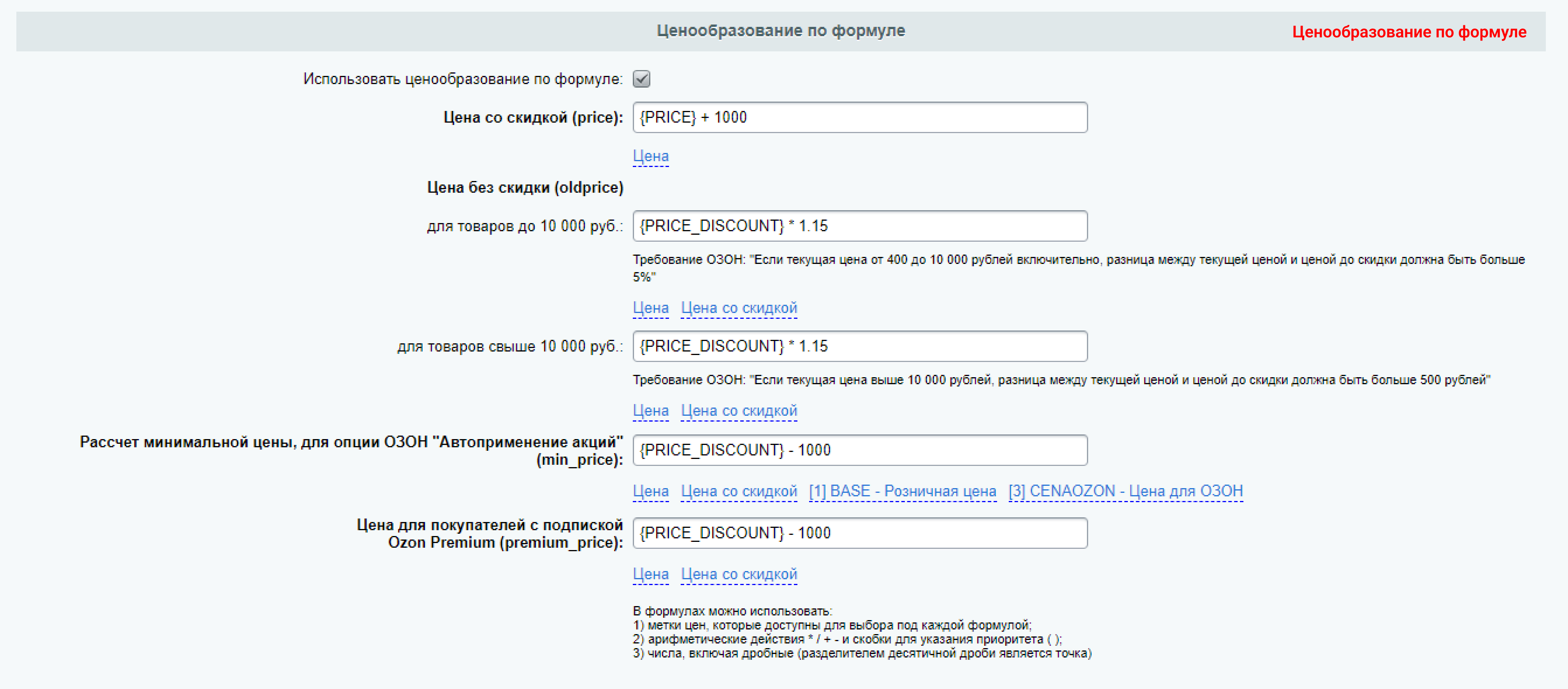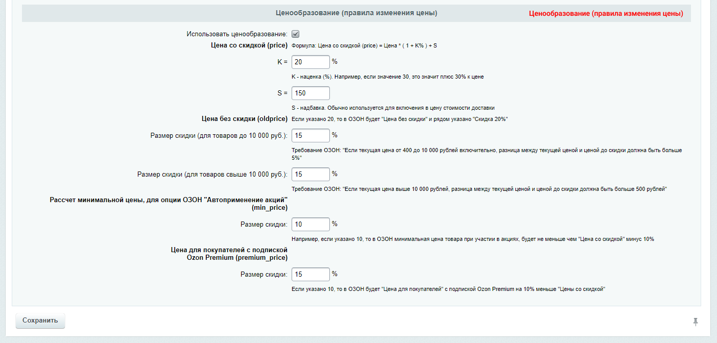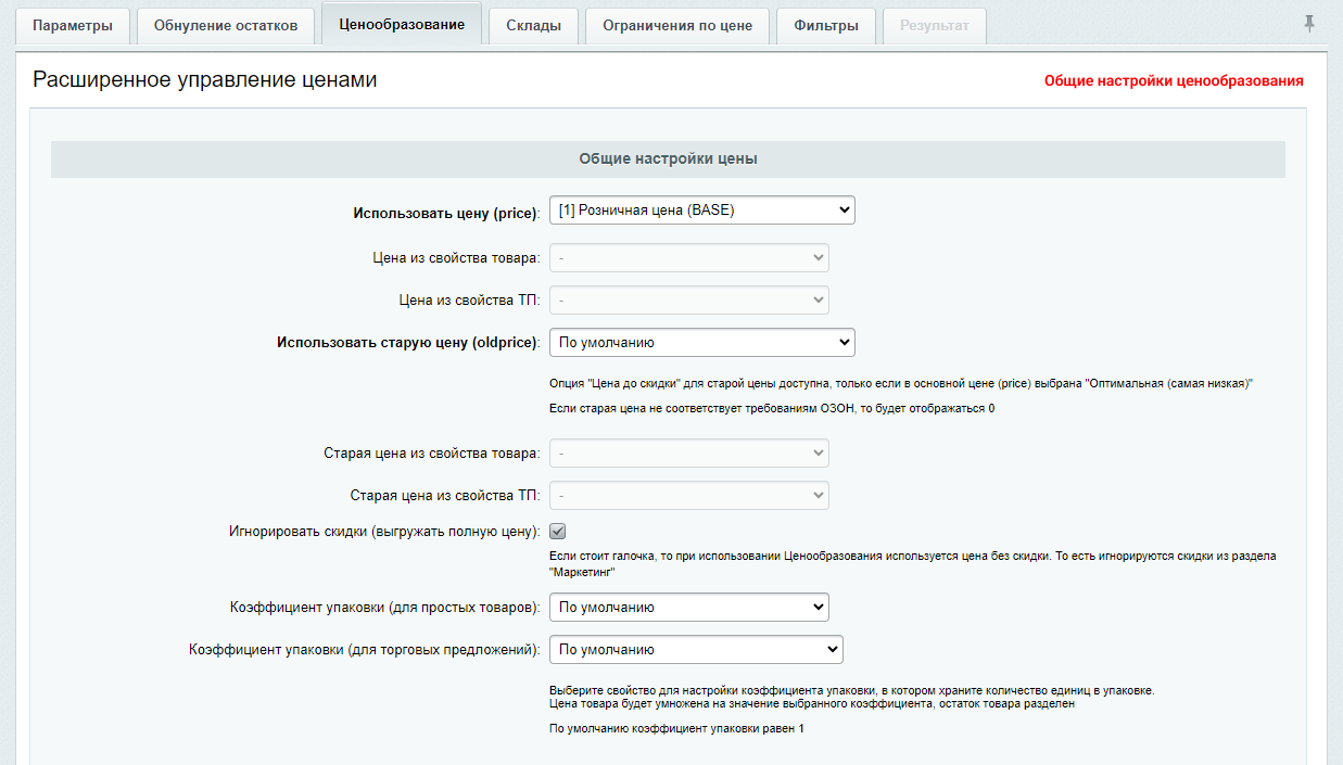 - Выгрузка цен товара без скидок из раздела "Маркетинг". Некоторые продавцы предпочитают продавать со скидками только на сайте, а на ОЗОН выгружать полную цену товара (например РРЦ).