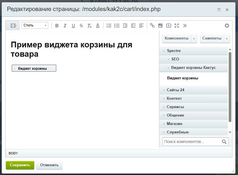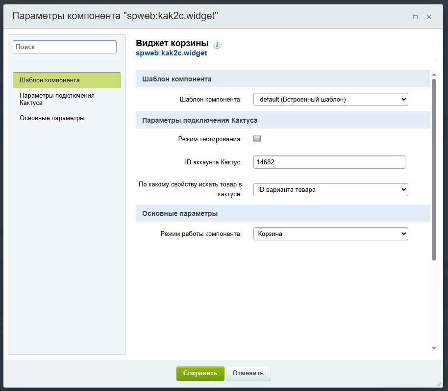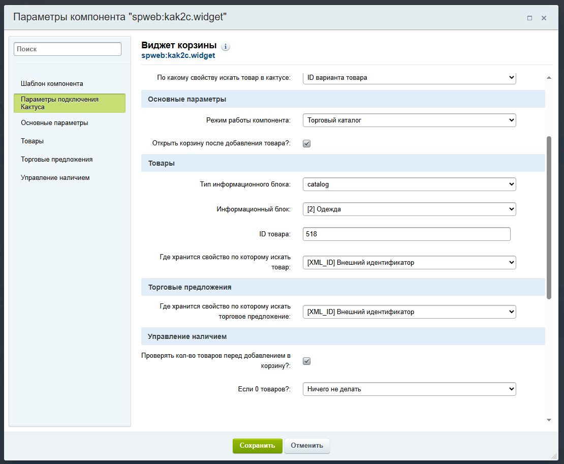 Умеет проверять кол-во товаров, перед добавлением в корзину, находить товары как по ID товара (ID используемому в системе кактус) так и по внешнему ID, может быть любым, уникальным произвольным значением.