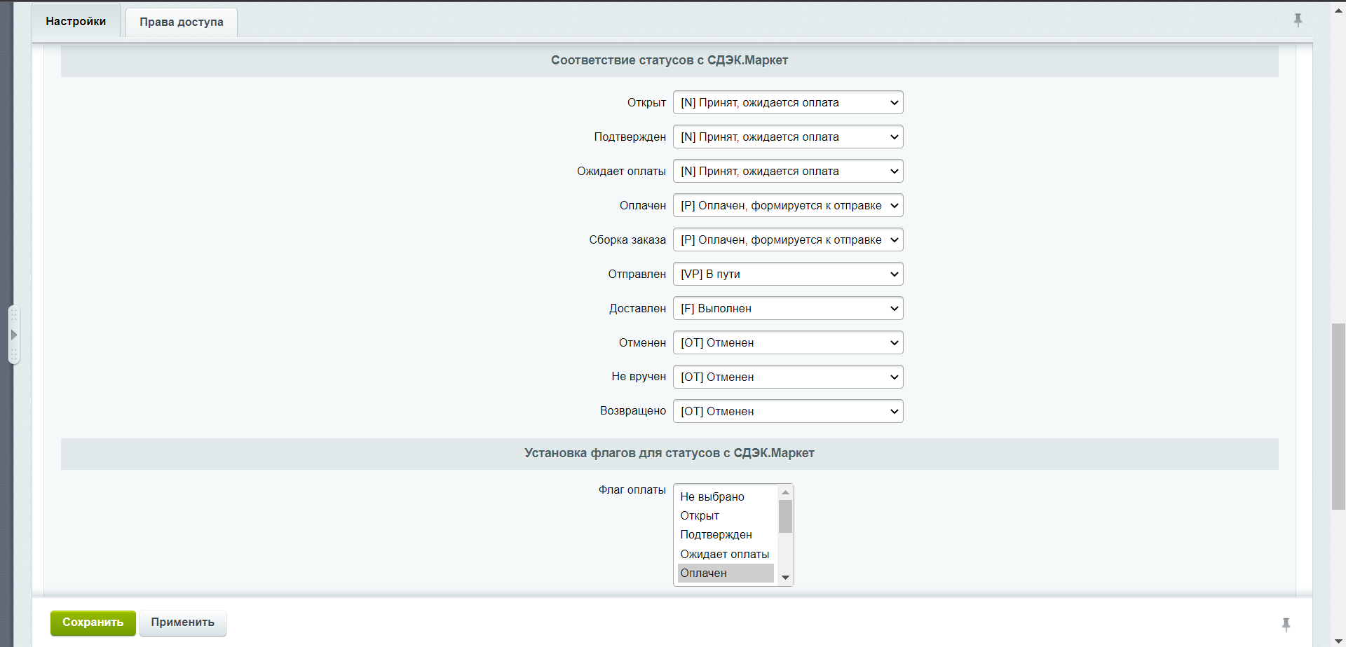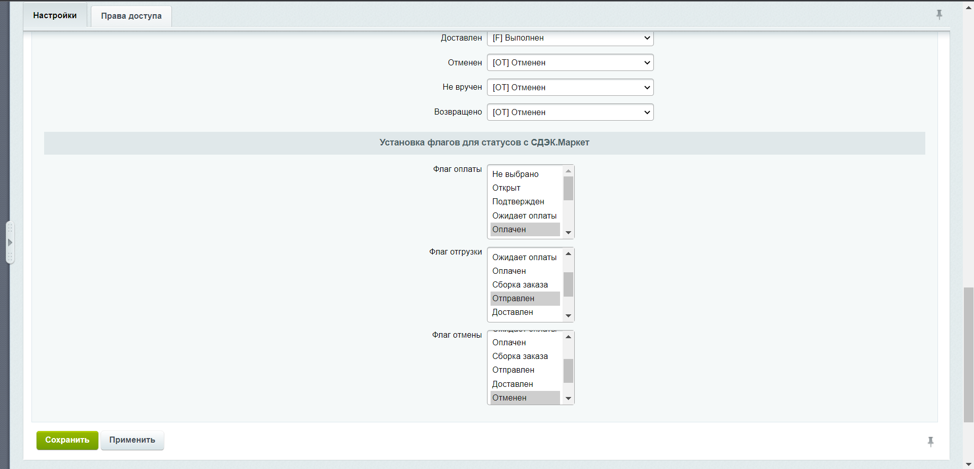 Внимание! В данный момент реализовано одностороннее получение статусов из "СДЭК Маркет" на сайт. Отправка статусов с сайта на "СДЭК Маркет" находится в разработке.