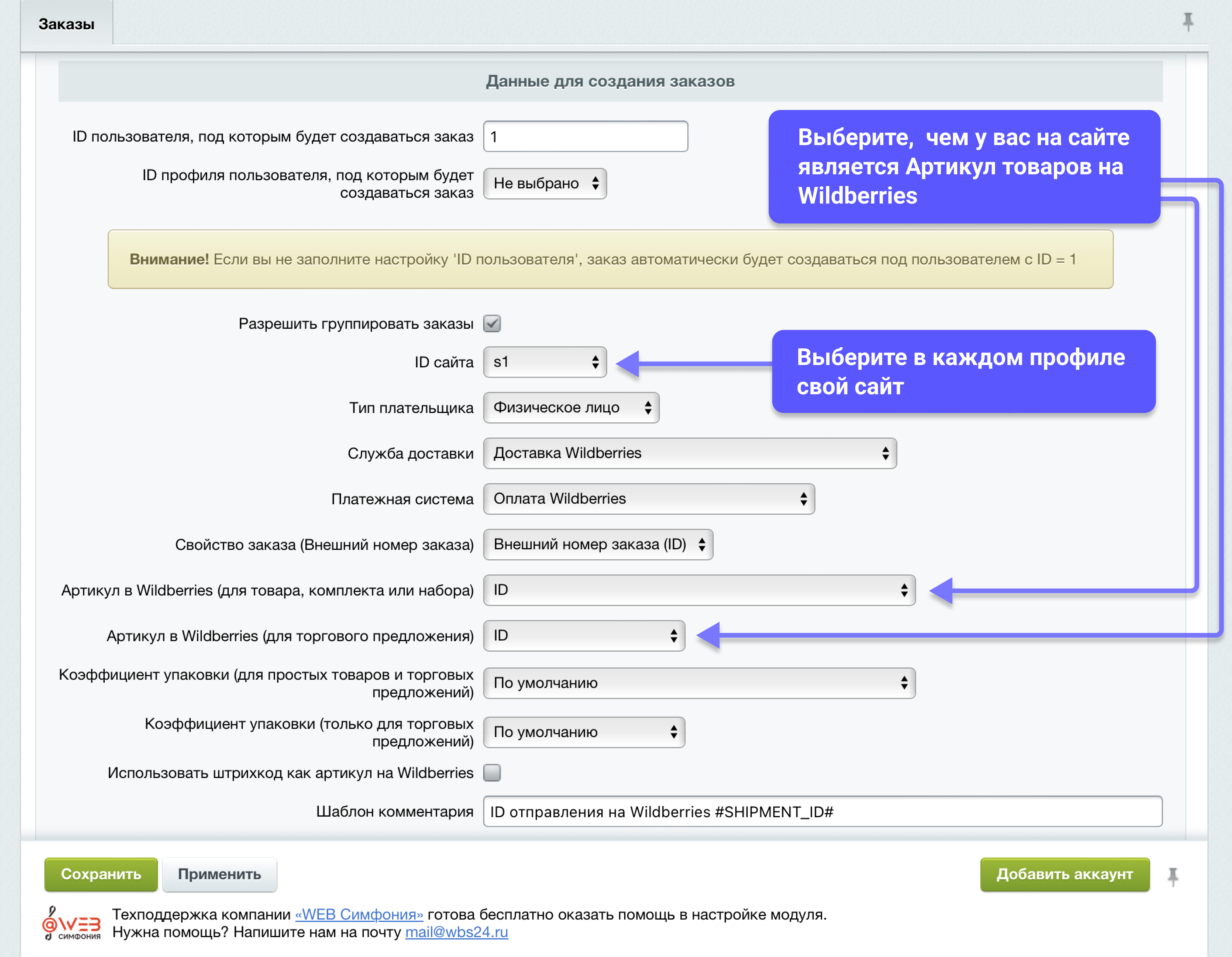 - Получение и формирование заказов на сайте. После поступления заказа на WB он в считанные минуты формируется на сайте. Модуль получает из Wildberries все необходимые данные.