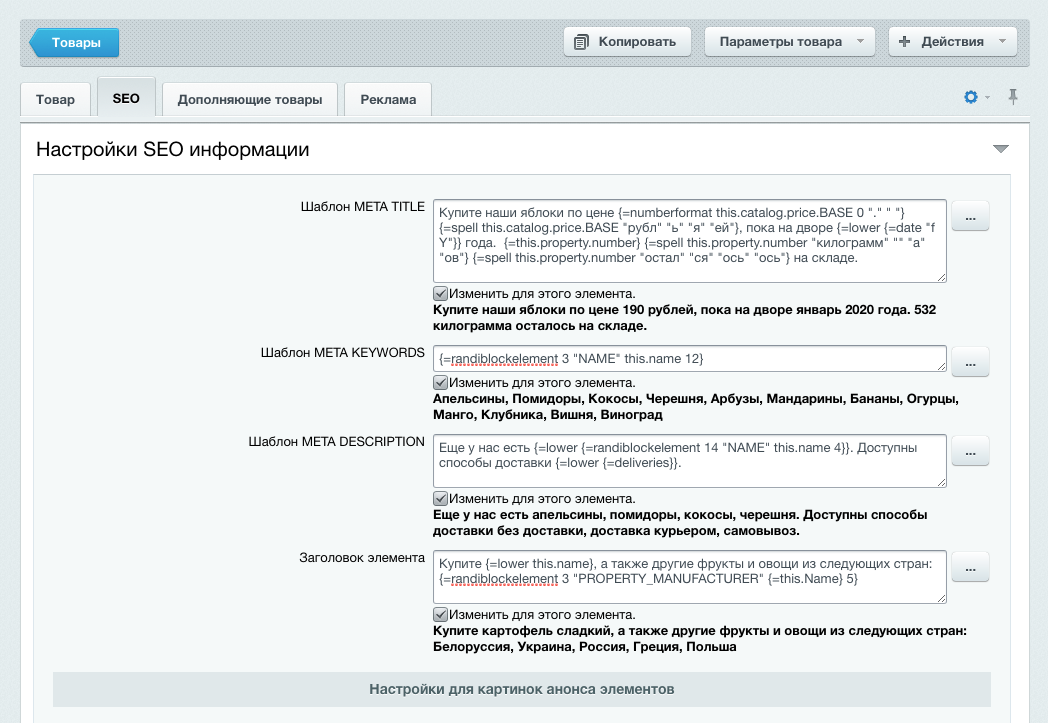 - Вывод значений (например, заранее заготовленных фраз) из модуля «Дополнительные настройки» (модуль бесплатный)