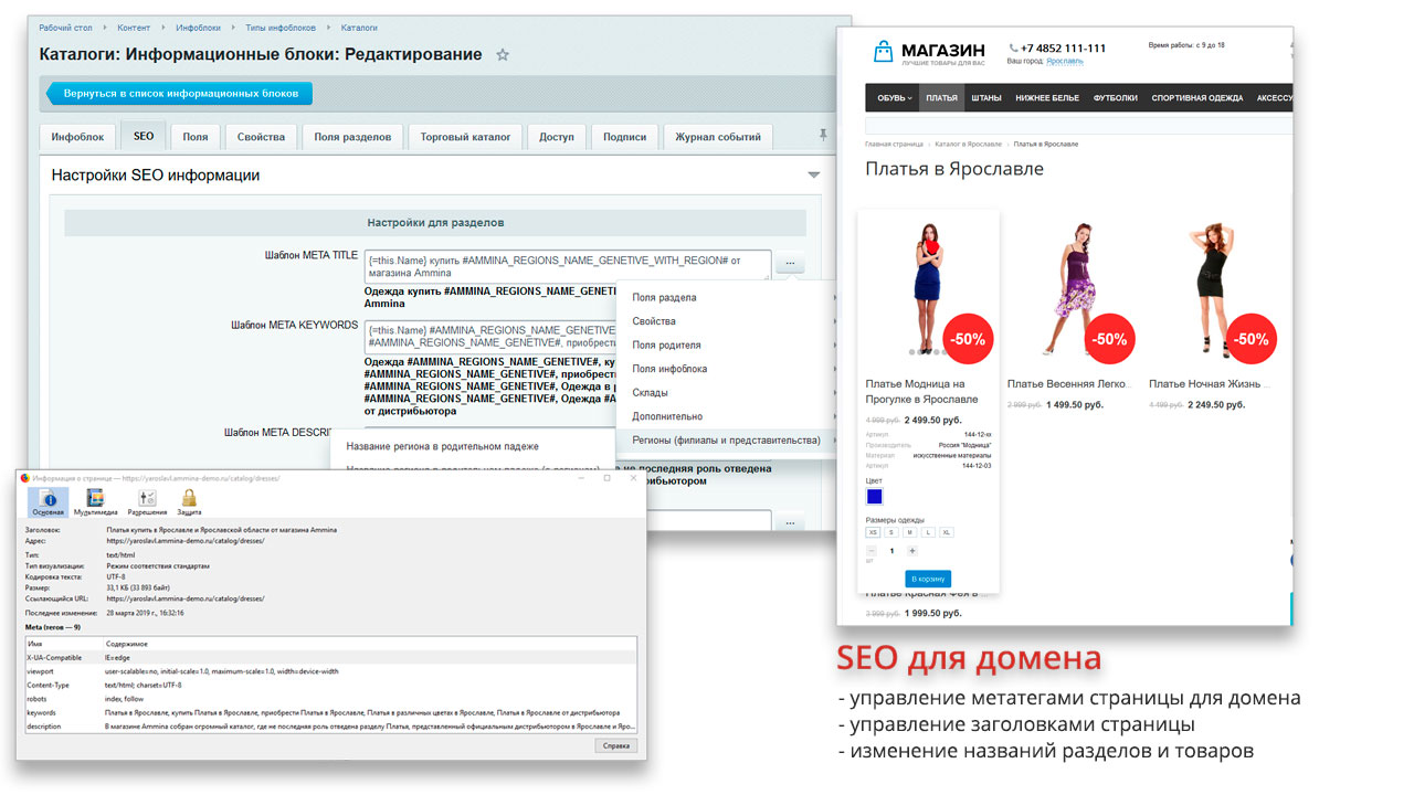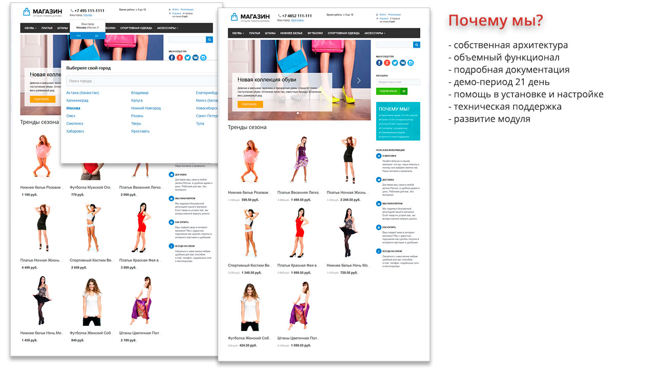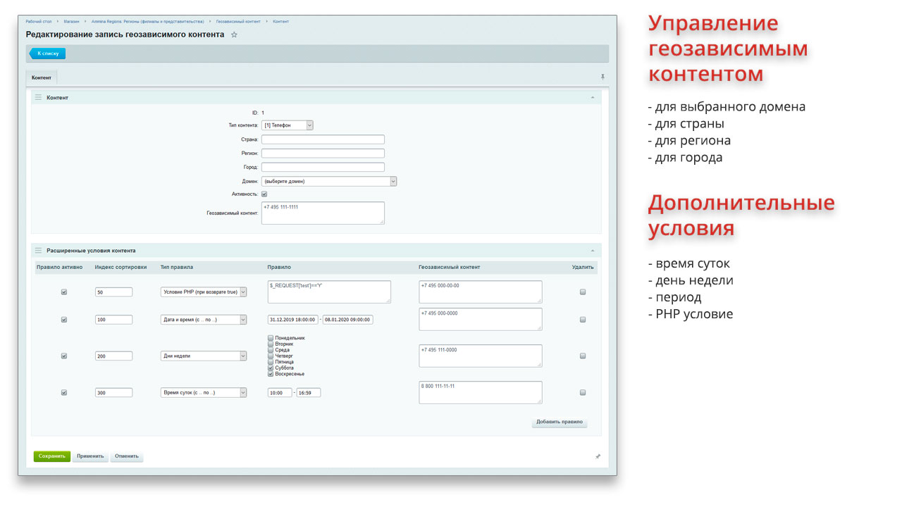 | | Вывод геозависимого контента Для каждого региона могут быть выведены собственные контактные данные, время работы и прочая информация. Так же данная информация может изменяться в зависимости от города/региона/страны пользователя, времени суток, дня недели, временного интервала, либо от любого условия, написанного на PHP | | Контент по регионам Модуль позволяет ограничить контент для каждого региона: новости, товары, статьи (элементы инфоблоков), категории товаров (разделы инфоблоков) и прочий контент (пользовательские свойства). |