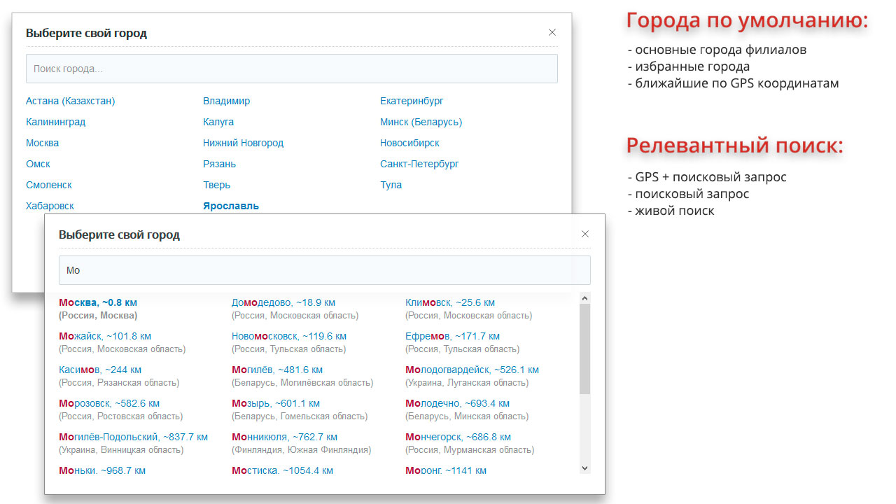 Модуль «Ammina: Регионы (филиалы и представительства)» использует локальную базу SypexGeo для определения города пользователя по IP адресу. Так же предоставляется возможность уточнения пользователем своего местоположения. При разрешении пользователем доступа к GPS данным, ему будут предложены на выбор ближайшие к нему города (релевантная сортировка по расстоянию).