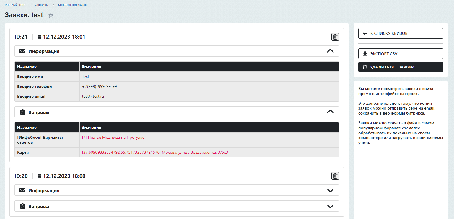 После отправки квиза клиентом, в данном модуле предусмотрено 3 варианта получение заявки, которые можно использовать как вместе, так и по отдельности: