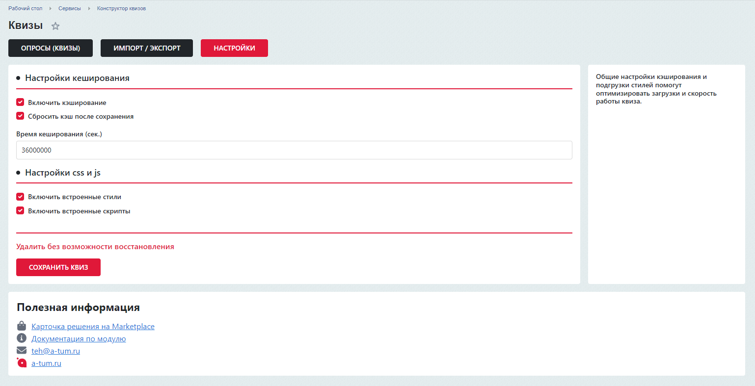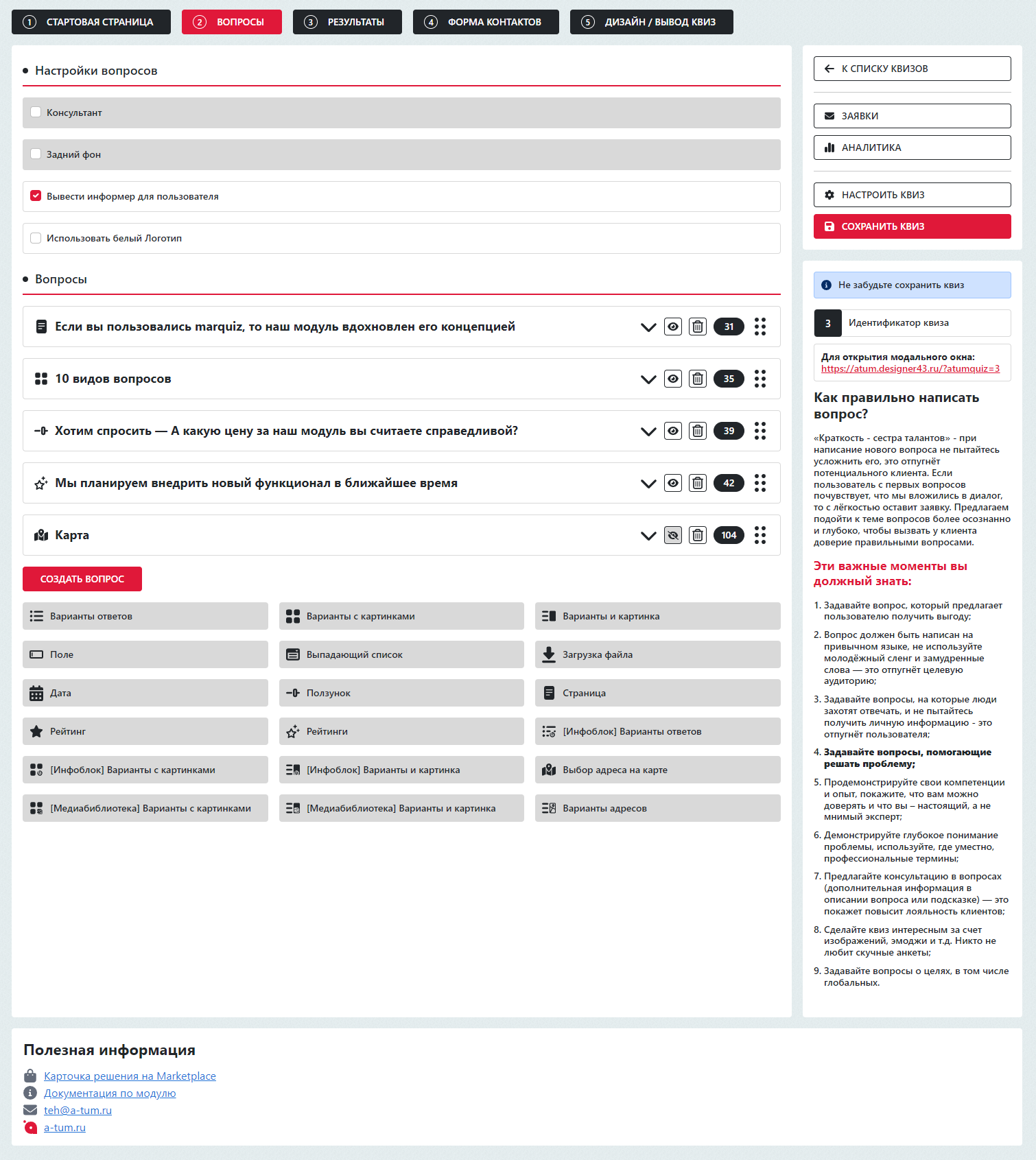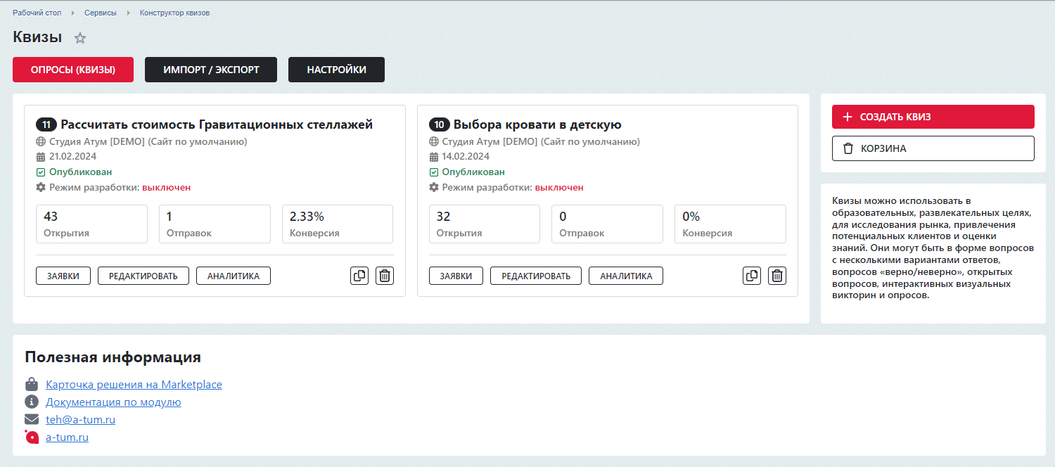 Современный, лаконичный интерфейс по мотивам Marquiz; Быстрая установка и настройка в один клик; Интуитивно понятный интерфейс; Большое количество вариантов вопросов с настройками; Быстро без знания программирования создавайте формы заявок и интерактивные опросы, тесты, анкеты, викторины и т.д.; Неограниченное количество квизов на одной платформе 1С-Битрикс; Быстрое добавление товара из инфоблока в вопросы и результаты; Возможность кастомизировать внешний вид окна квиза; Используется сторонний визуальный редактор TinyMCE для ввода текста; Создание и редактирование шаблона квиза, Уведомление в Telegram; Помощь в настройке и установке модуля.