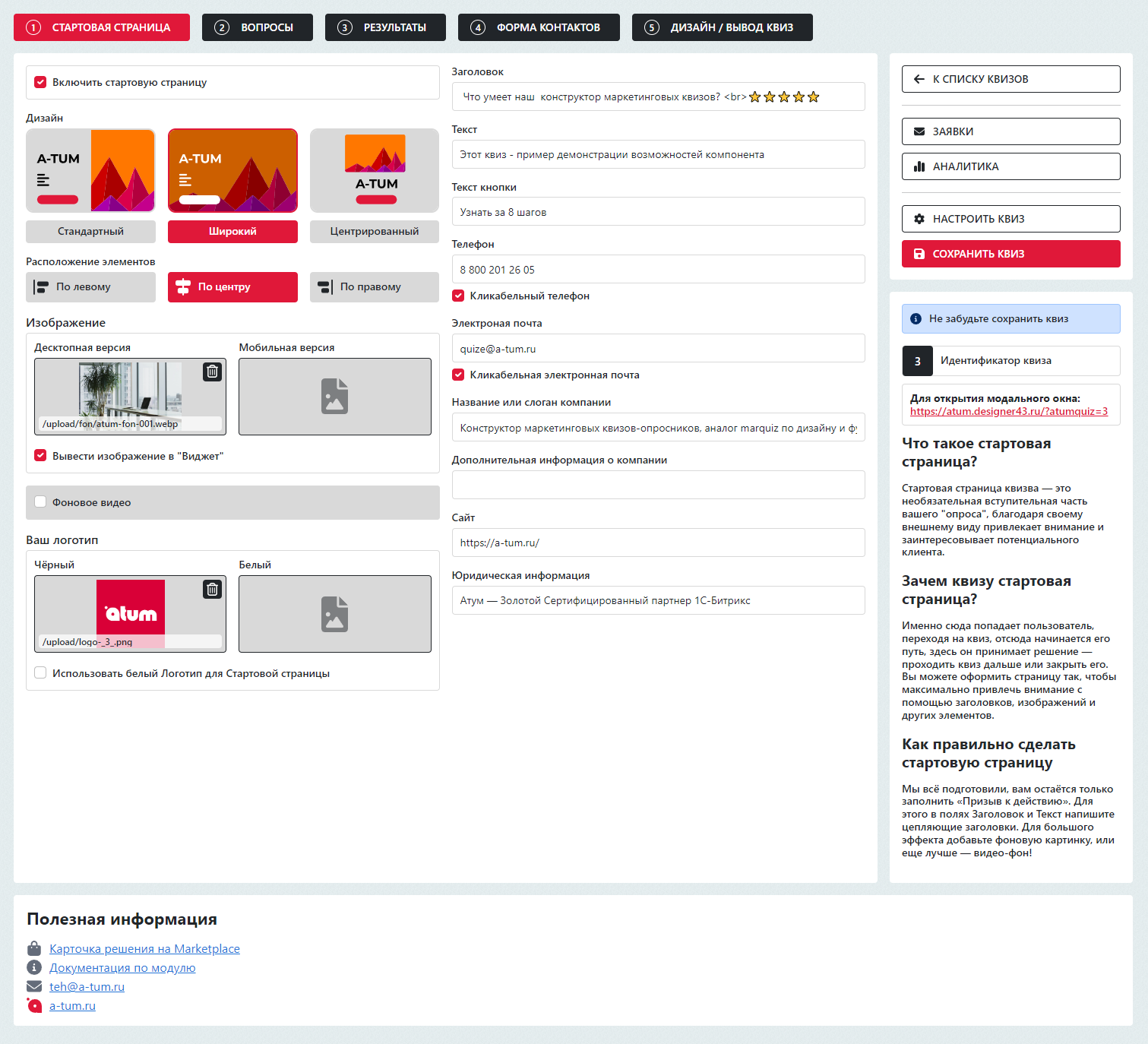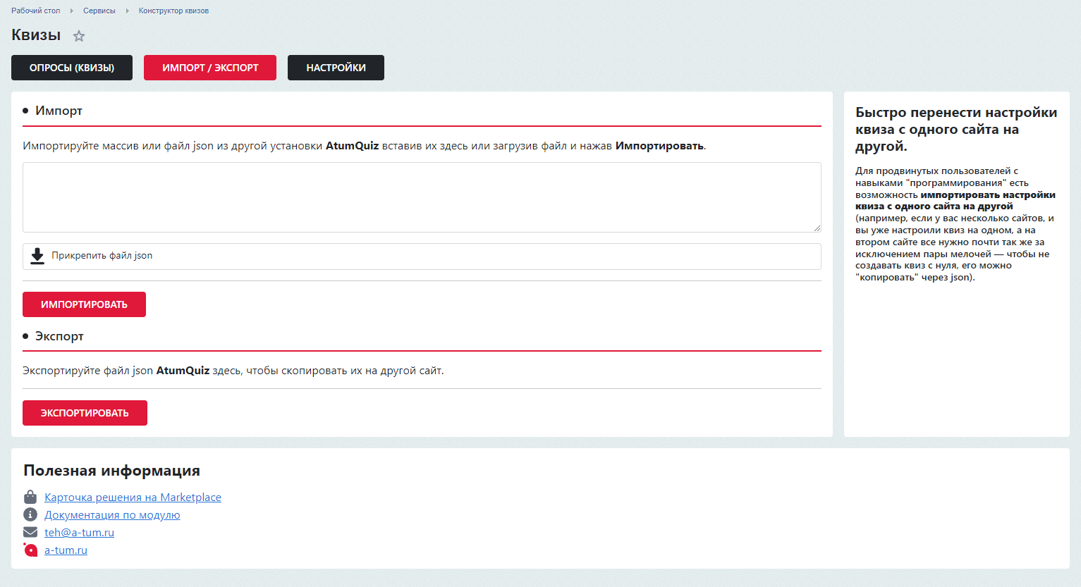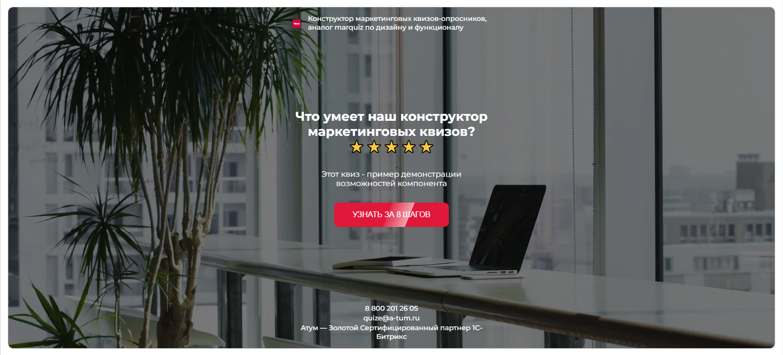 Современный, лаконичный интерфейс по мотивам Marquiz; Быстрая установка и настройка в один клик; Интуитивно понятный интерфейс; Большое количество вариантов вопросов с настройками; Быстро без знания программирования создавайте формы заявок и интерактивные опросы, тесты, анкеты, викторины и т.д.; Неограниченное количество квизов на одной платформе 1С-Битрикс; Быстрое добавление товара из инфоблока в вопросы и результаты; Возможность кастомизировать внешний вид окна квиза; Используется сторонний визуальный редактор TinyMCE для ввода текста; Создание и редактирование шаблона квиза, Уведомление в Telegram; Помощь в настройке и установке модуля.