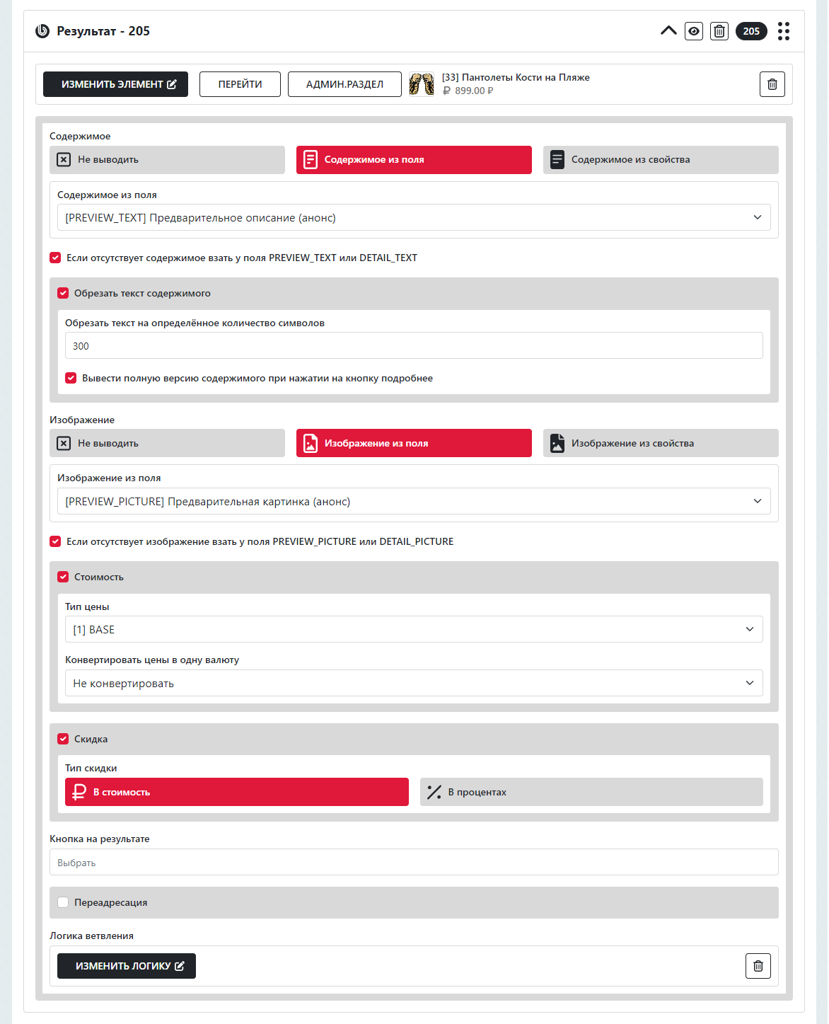 Результата: Контент, Переадресация, Привязка инфоблока.