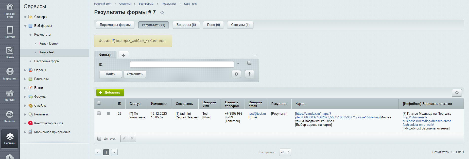 Сохранять результат в модуле, Отправить результат на почту, Сохранять результат в Веб-формы Битрикс, Сохранять результат в Инфоблоке Битрикс, Отправить результат в Telegram.
