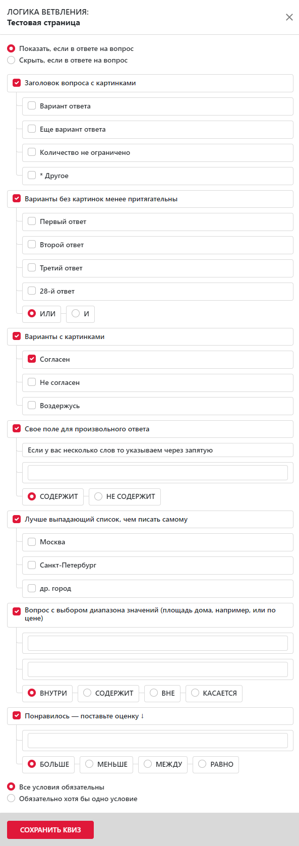 Вы можете создать условие для вопроса или результата — скрыть или показать в квизе вопрос, если на предыдущие вопросы были даны ответы согласно условиям:
