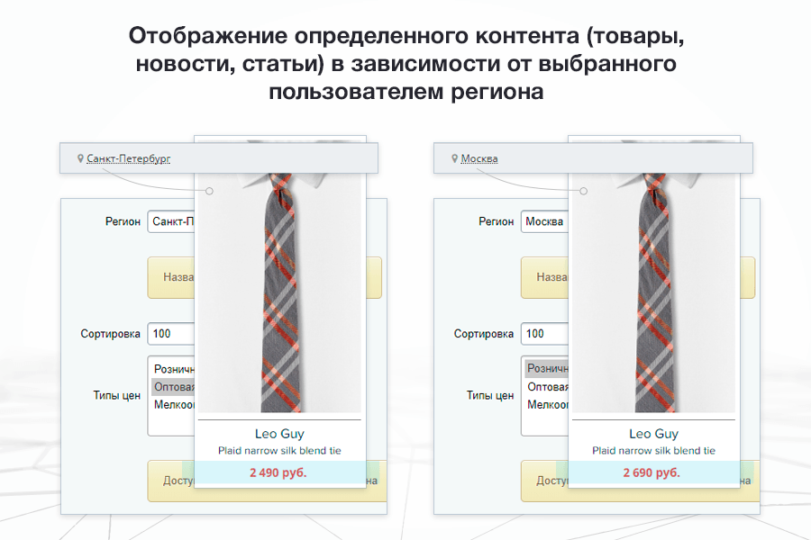 | | Вывод контактных данных Для каждого региона подставляются свои контактные данные. | | Вывод контента по регионам Модуль отображает свой контент для каждого региона: товары, новости, статьи. |