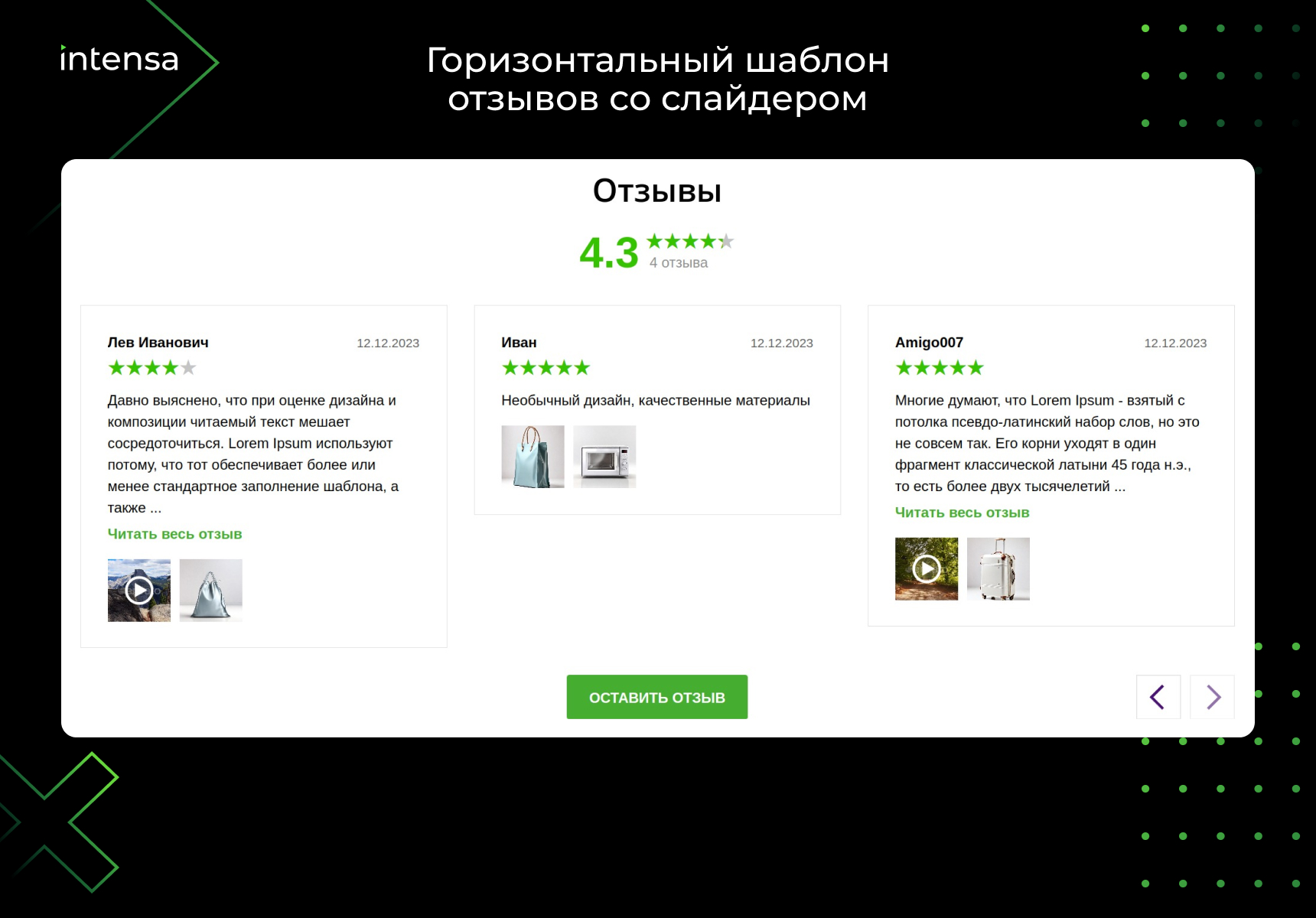 Предоставляется 2 шаблона на выбор: вертикальный и горизонтальный со слайдером. В настройках компонента можно указать разрешать ли оставлять отзывы неавторизованным пользователям.