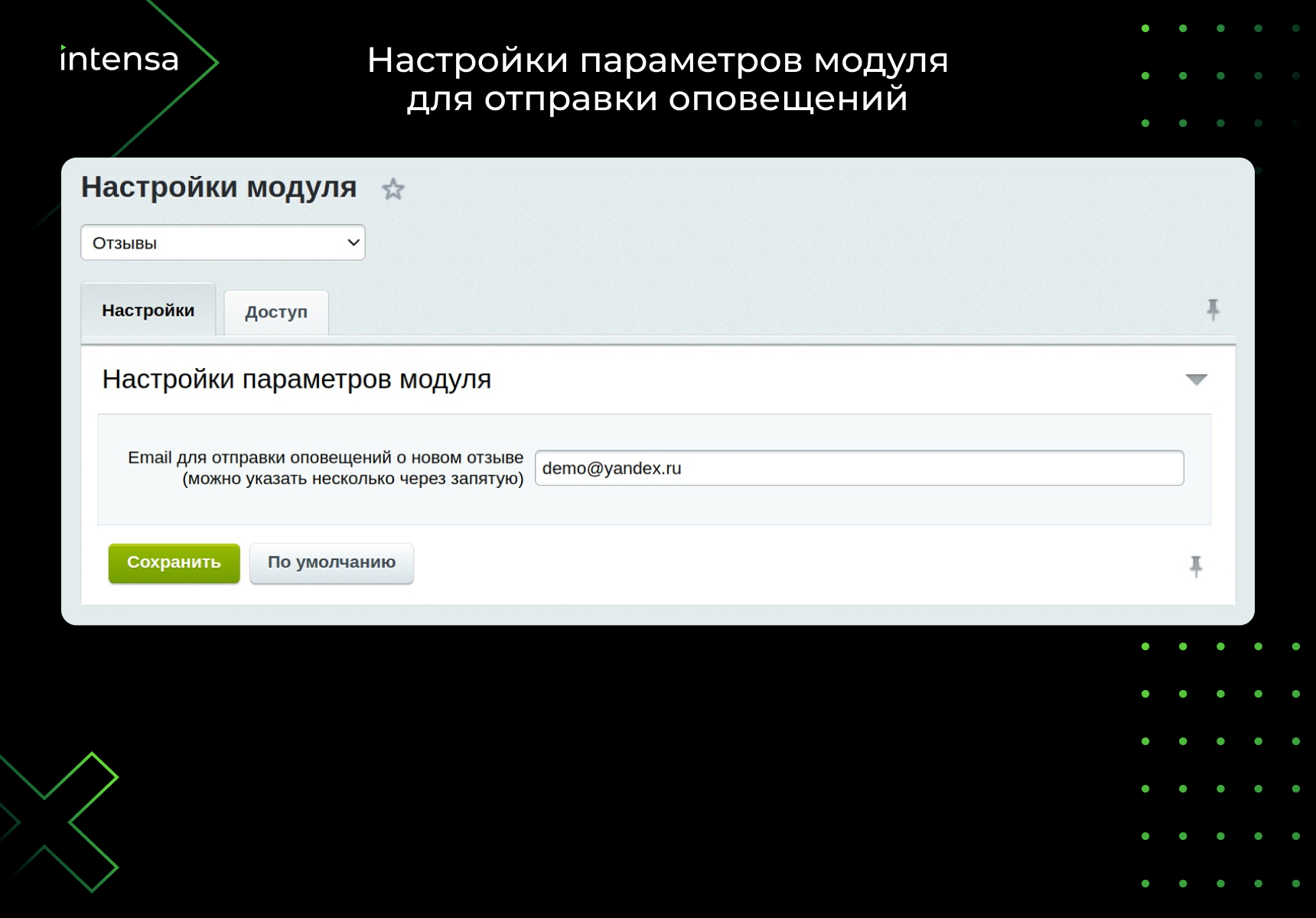 При необходимости можно отключать модерацию отзывов, задавать нужную сортировку. Модуль создает свою собственную таблицу в базе данных, никак не связанную с оценками или другими отзывами сайта.