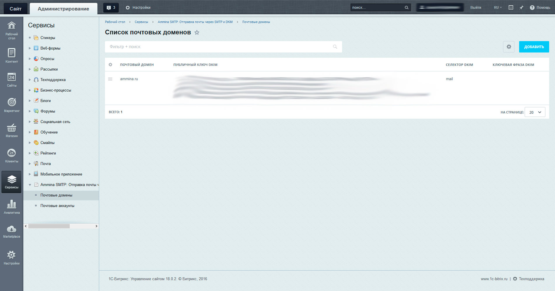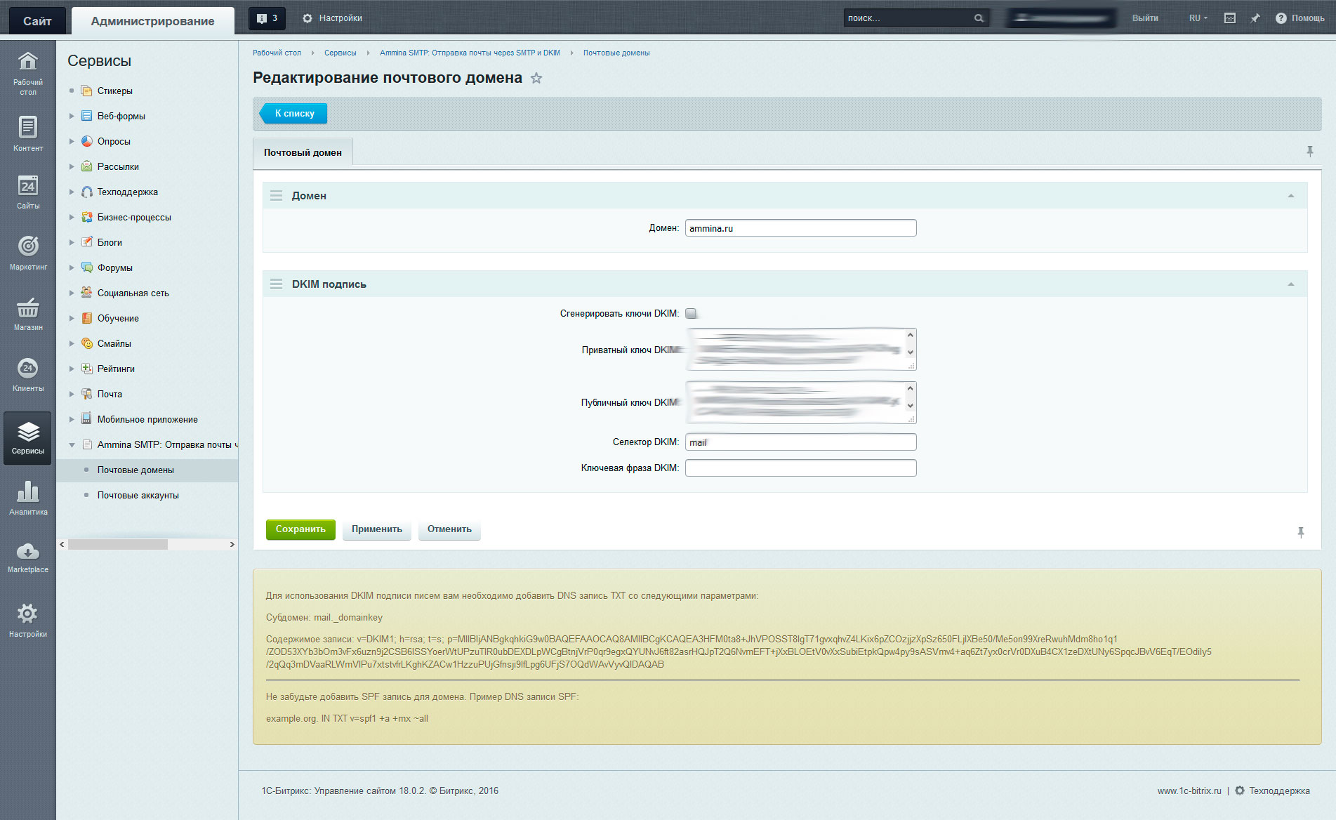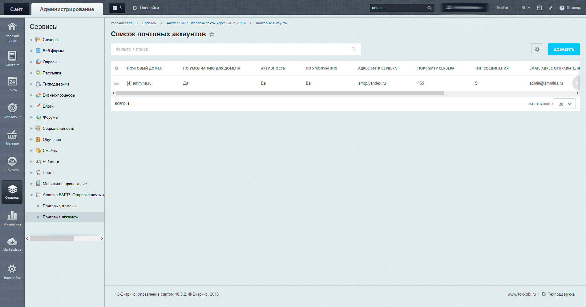 Модуль "Ammina: Отправка почты через SMTP и DKIM подпись (Битрикс, коробка Битрикс24, Интернет-магазин+CRM)" позволяет организовать отправку писем сайта через один или несколько почтовых аккаунтов SMTP серверов (таких как Yandex, GMail, Mail либо собственный почтовый сервер).Кроме того, возможна отправка почты штатными средствами битрикса с подписью отправляемых писем с помощью DKIM.