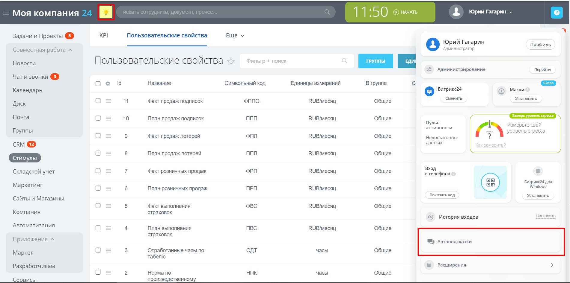 При наличии опции «Разрешить повторный просмотр» в настройках модуля пользователю на всех страницах портала, для которых были созданы автоподсказки и единожды были просмотрены, будет выведена кнопка «Лампочка» (см. рисунок 6), по нажатию на которую пользователь сможет инициировать повторный показ автоподсказок.