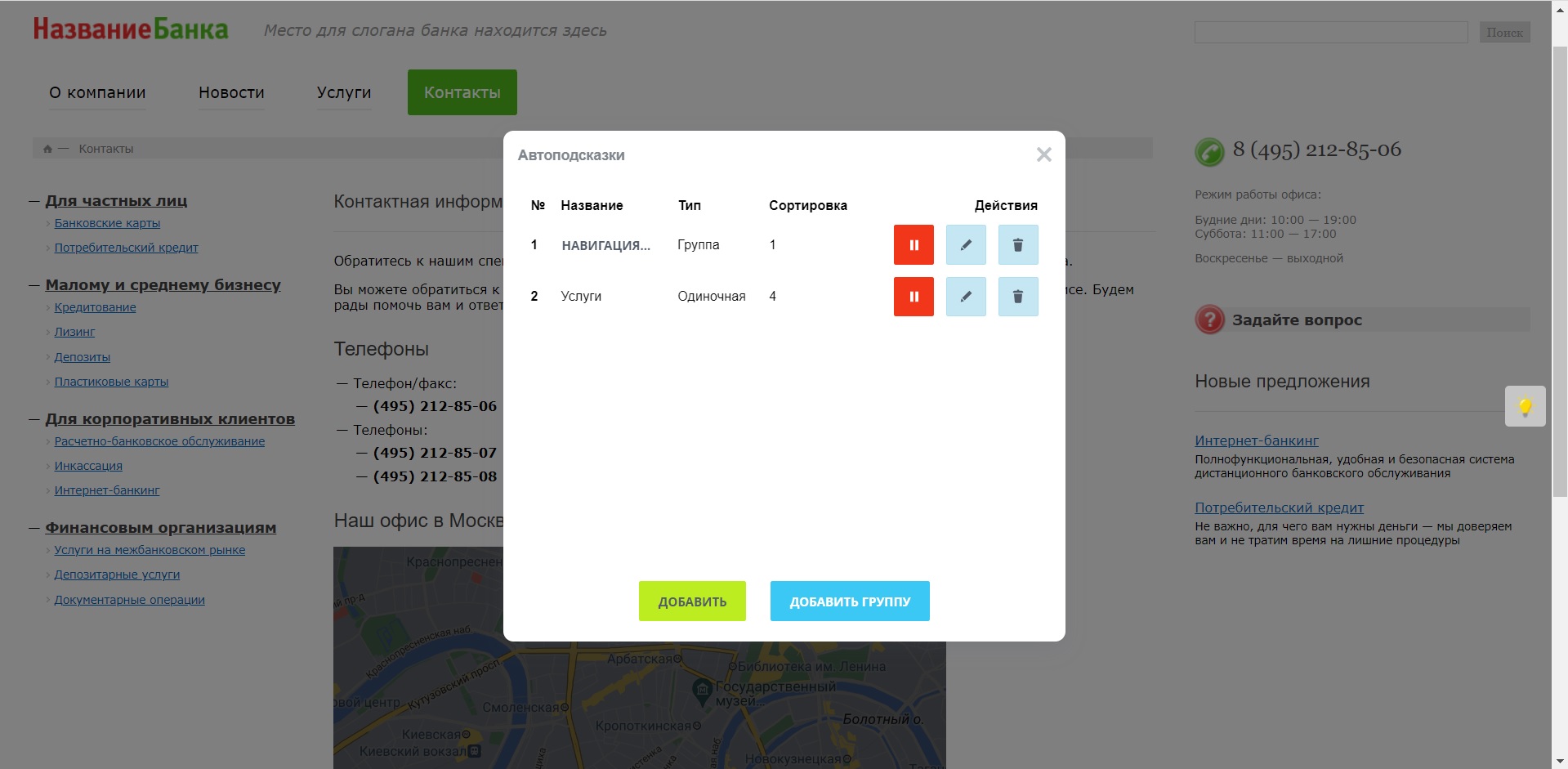 В открывшемся pop-up-окне необходимо внести название группы автоподсказок и порядковый номер сортировки (автоподсказки, входящие в группу, чей порядковый номер группы автоподсказок ниже, будут показаны на странице первыми, при равенстве порядковых номеров групп автоподсказок, первыми будут показаны автоподсказки той группы, чей id ниже) и нажать на одну из кнопок «Применить», если планируется редактирование данных группы автоподсказок, либо «Сохранить». В результате появится новая группа автоподсказок, как показано на рисунке 4.