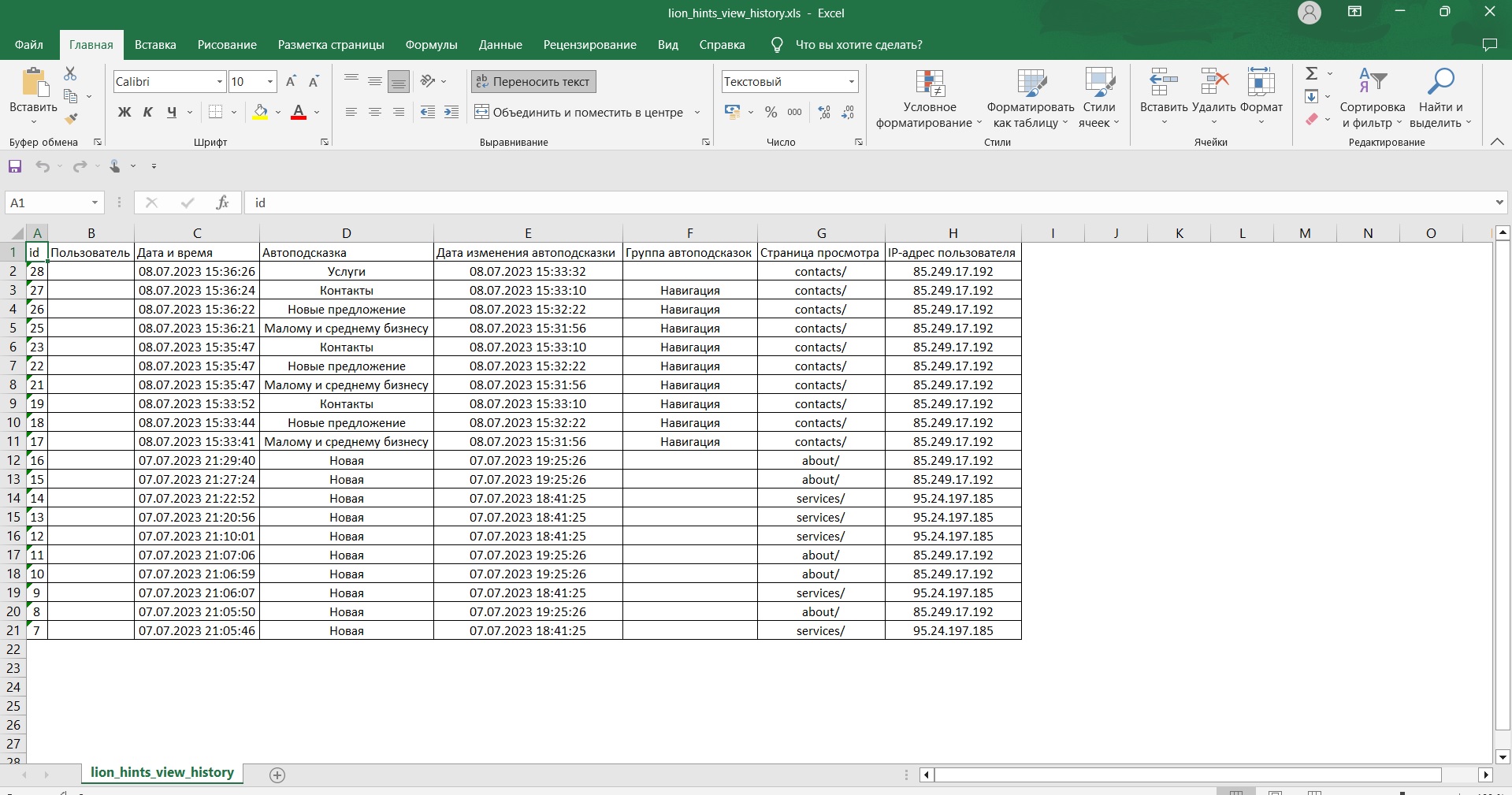 Все просмотры пользователей по умолчанию логируются. Информация о просмотрах автоподсказок доступна пользователю с доступом к административной части портала на странице «Автоподсказки: История просмотра», расположенную в разделе «Сервисы». Страница показана на рисунке 7.