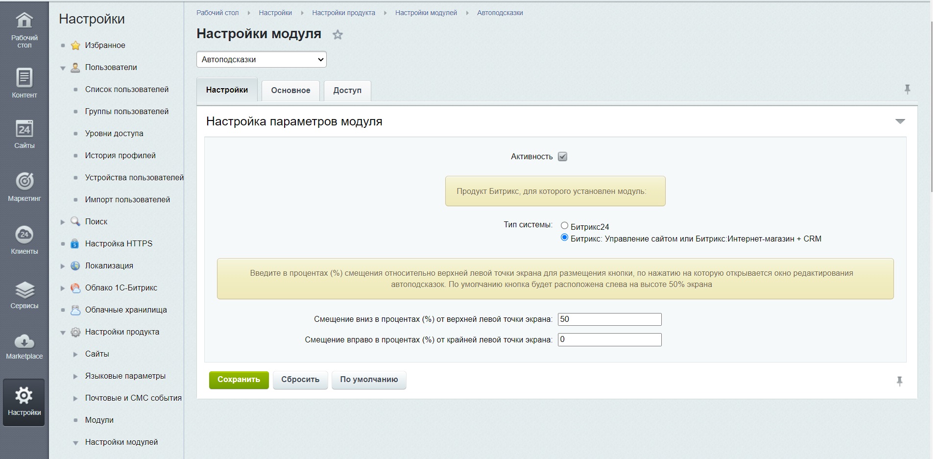 - Существует возможность деактивировать модуль, не удаляя его (отключить весь функционал), а также сохранять настройки модуля и автоподсказки с историей их просмотра при удалении модуля.