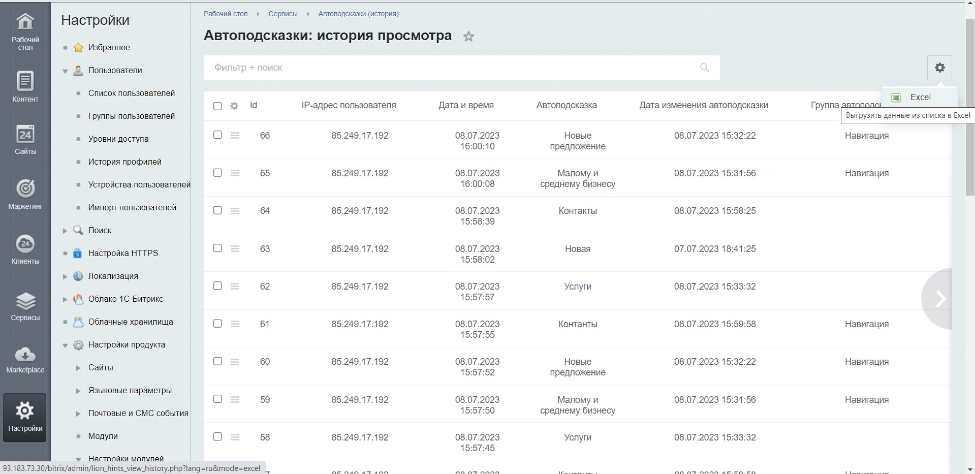 На странице доступна к просмотру информация из 16 полей для агрегации статистики, которую в последствии можно экспортировать в Excel-файл (штатный функционал Битрикс формирование Excel-файлов с информацией, расположенной в таблице на странице).