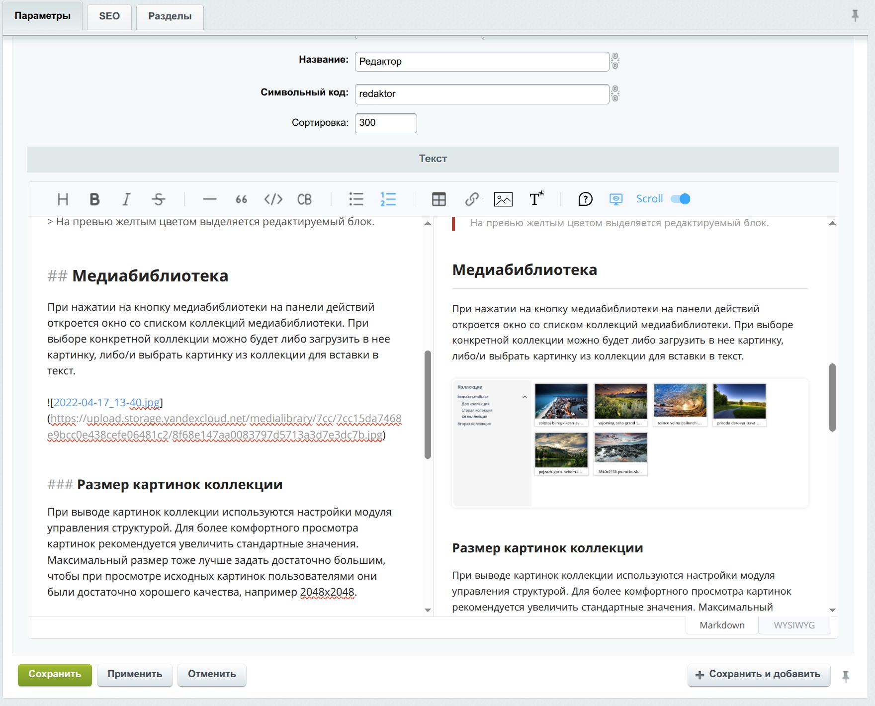 В модуле есть редактор текста в markdown-разметке, позволяющий вводить текст в markdown и WYSIWYG режимах (2 на скриншоте).