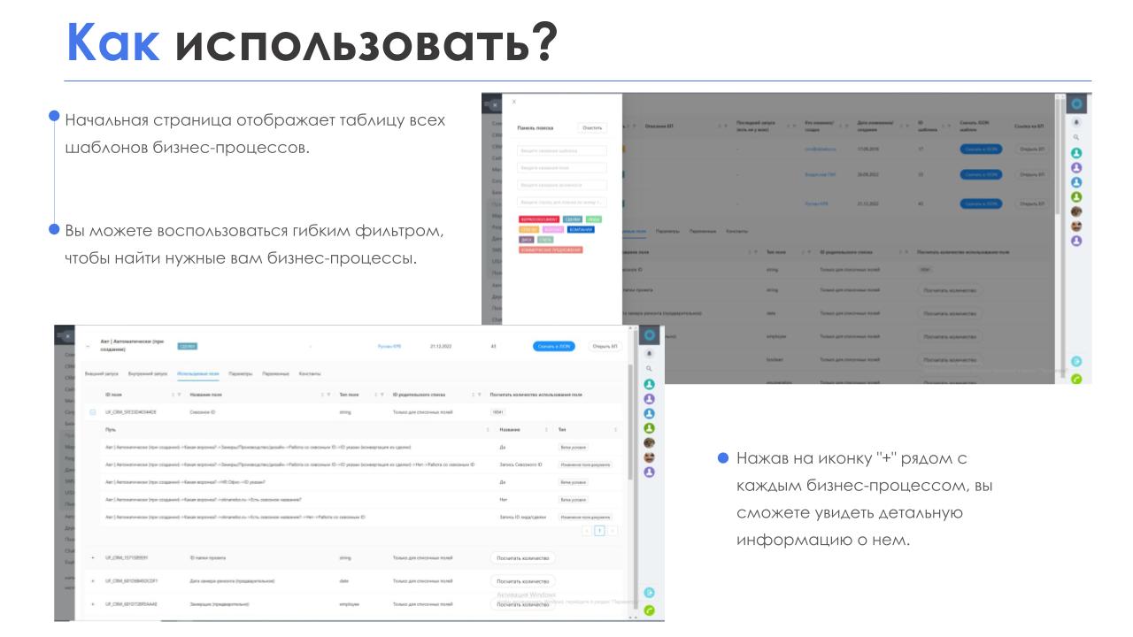 Приложение “Дерево БП” показывает список всех бизнес-процессов в CRM, их описание и детальную информацию, включающую в себя используемые поля, а также внутренние и внешние запуски БП в виде дерева.