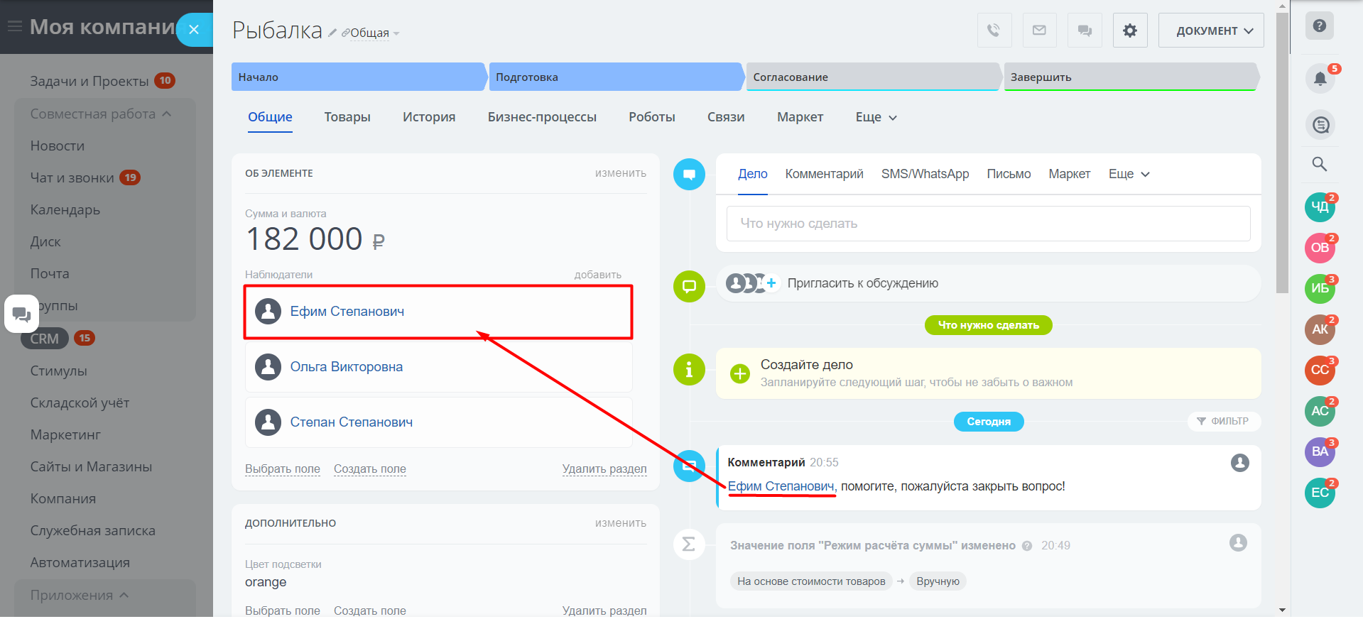 Комментарий с отмеченными пользователями как и всегда попадает в ленту карточки экземпляра смарт-процесса, а спустя 1,5 секунды осуществляется перезагрузка боковой панели с карточкой экземпляра смарт-процесса для того, чтобы автор комментария смог увидеть в наблюдателях отмеченного им человека без необходимости перезагружать боковую панель.
