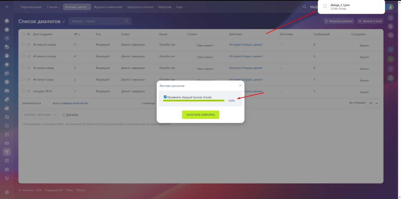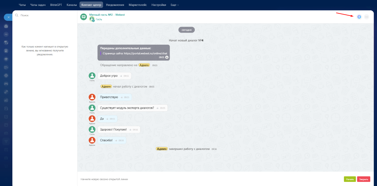 Если требуется выгрузить отдельную переписку, экспорт доступен непосредственно из карточки диалога.