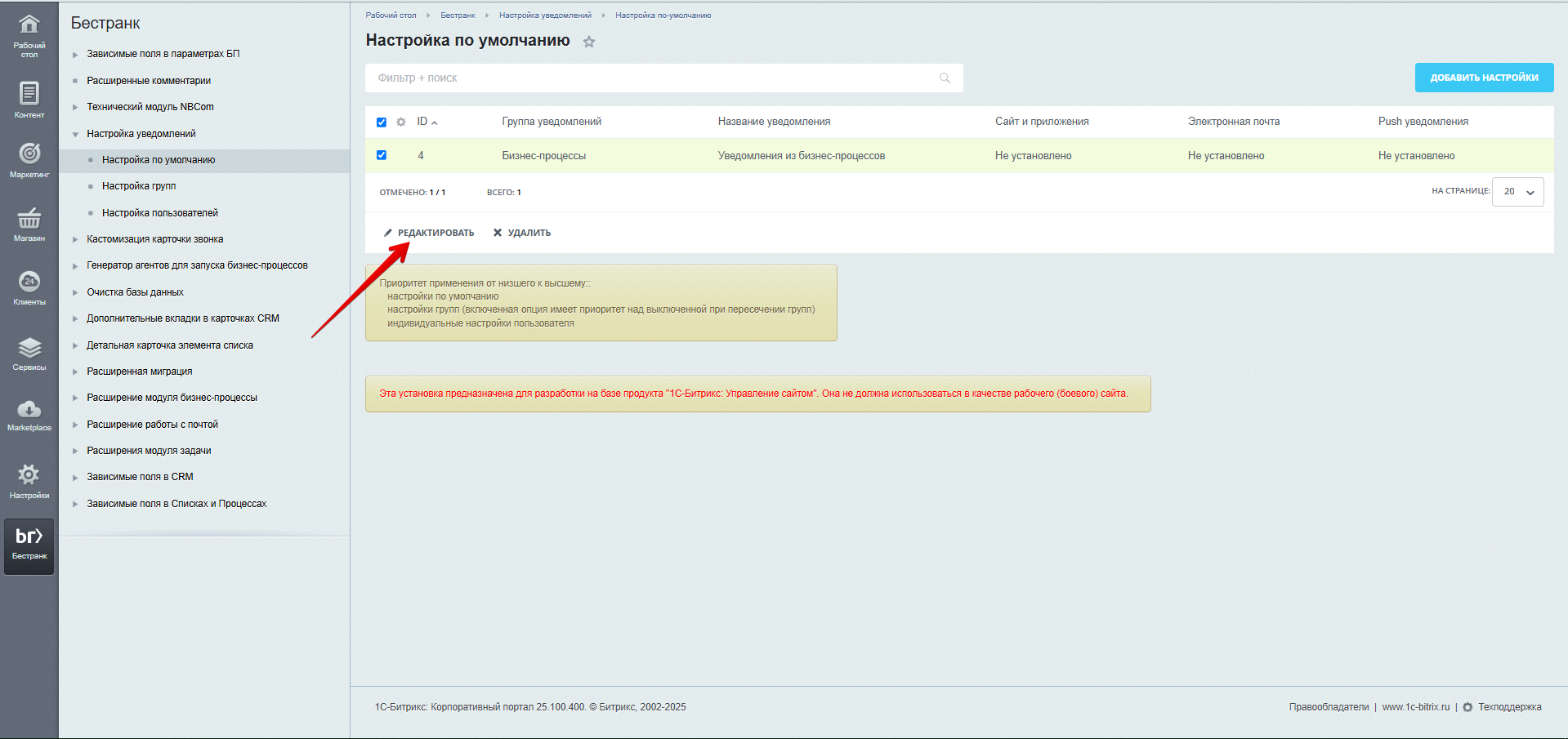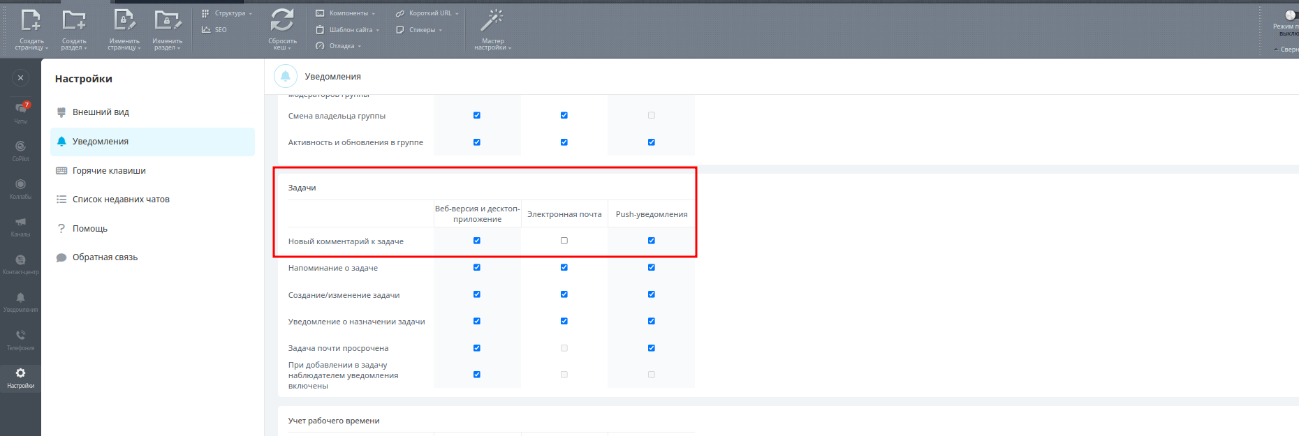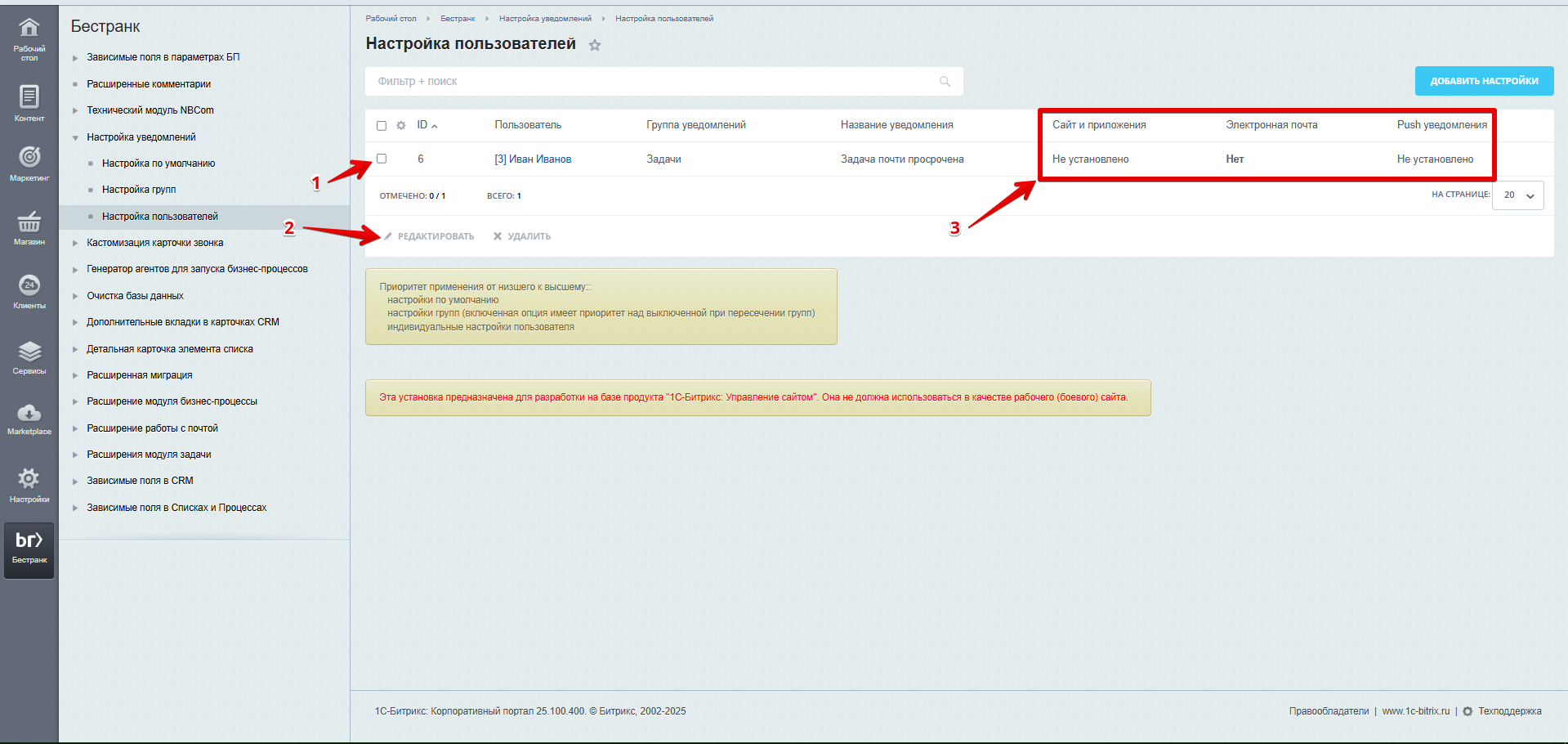 Модуль работает со всеми штатными способами отправки уведомлений на портале (CRM, задачи, бизнес-процессы, сообщения и др.).