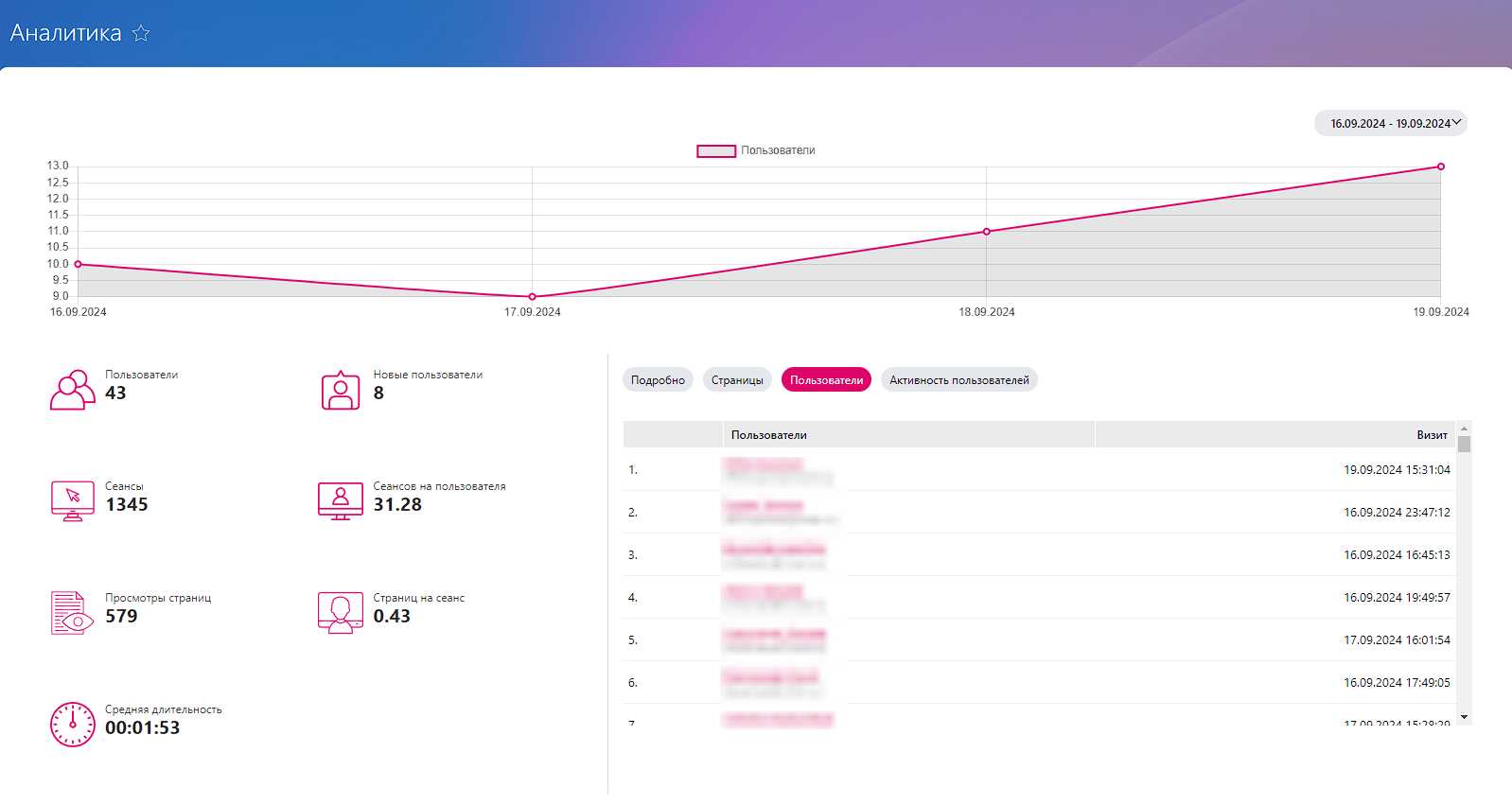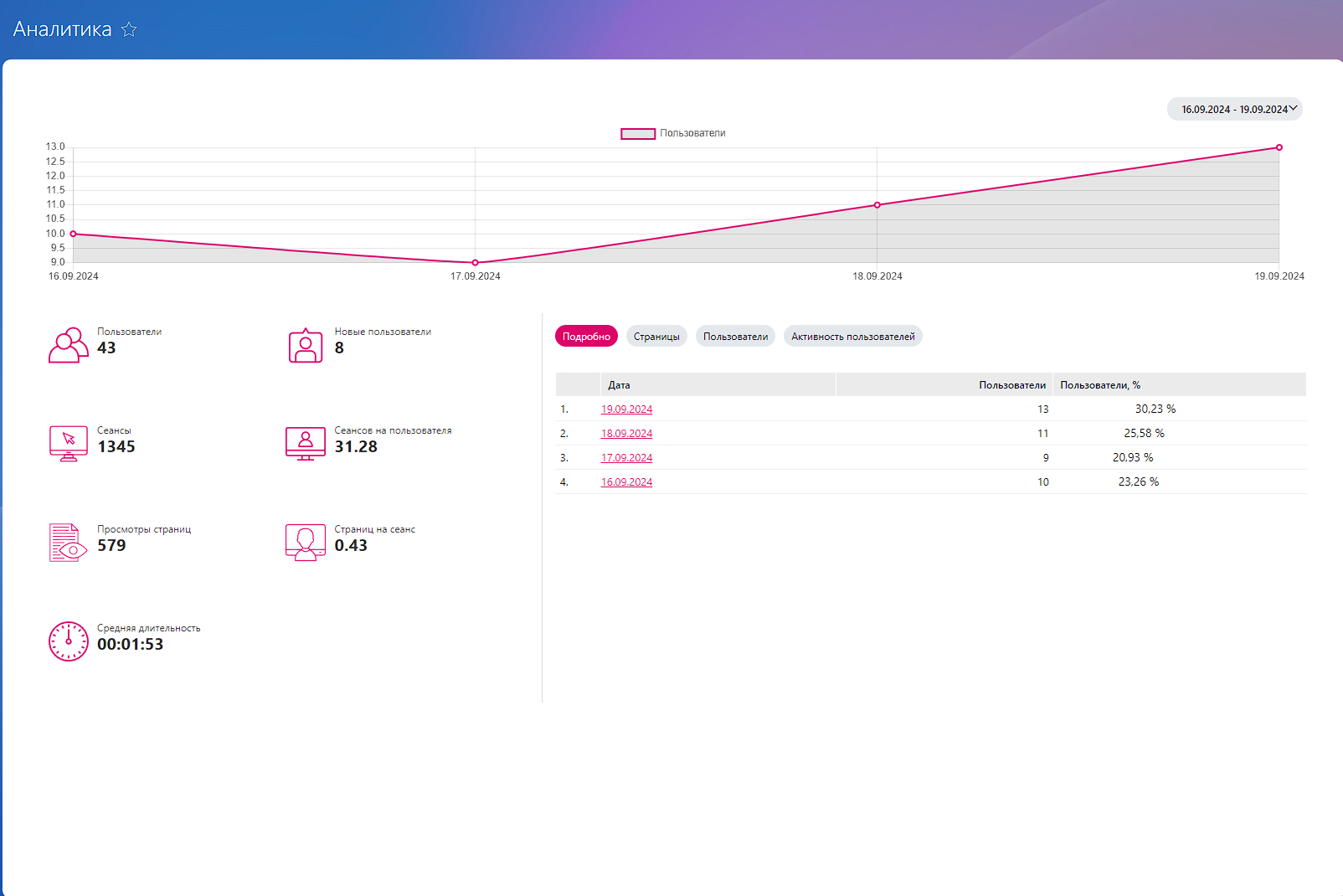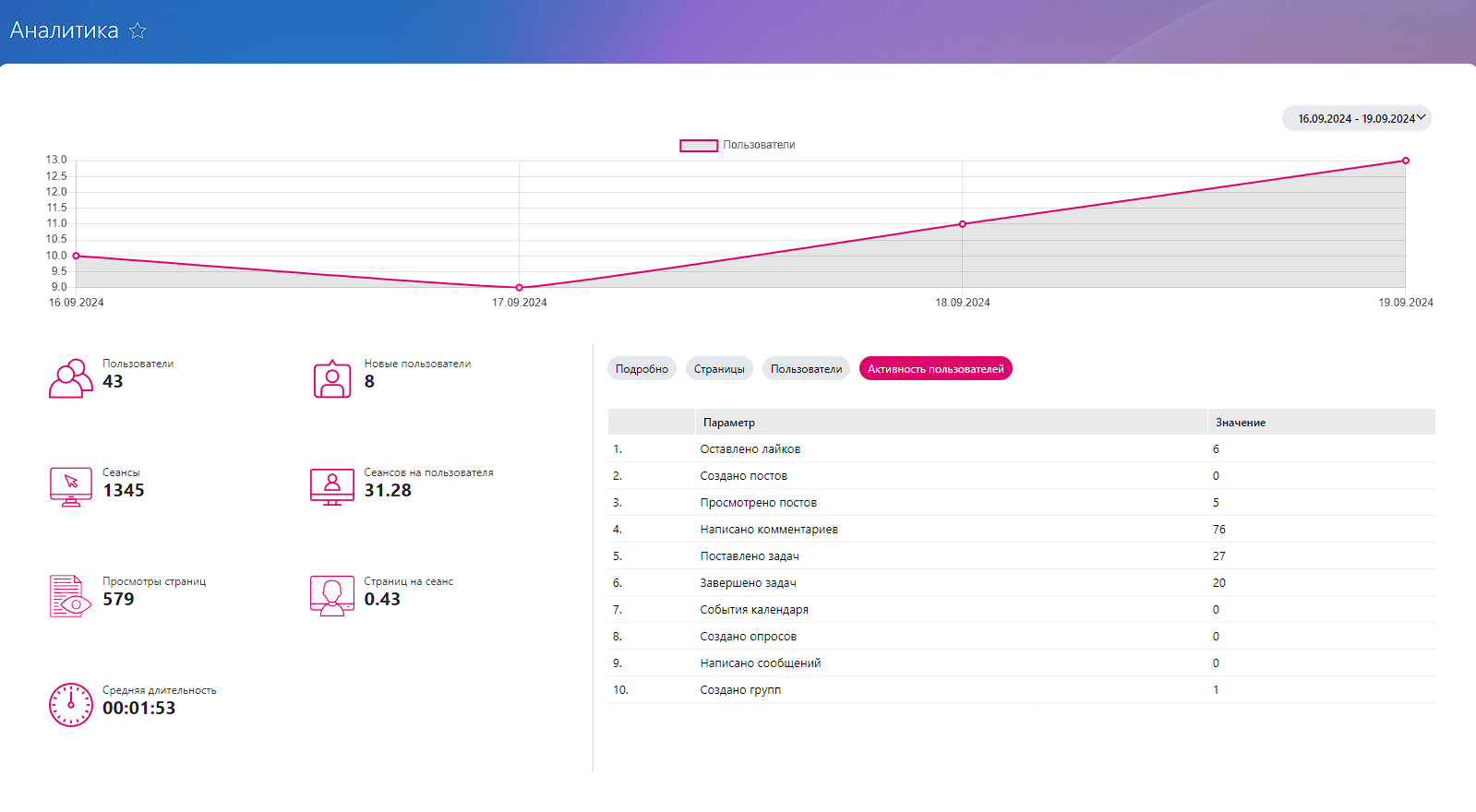 - Уникальные пользователи за указанный период. Определите, сколько различных сотрудников взаимодействует с вашей платформой. Это поможет в анализе активности и эффективности контента.