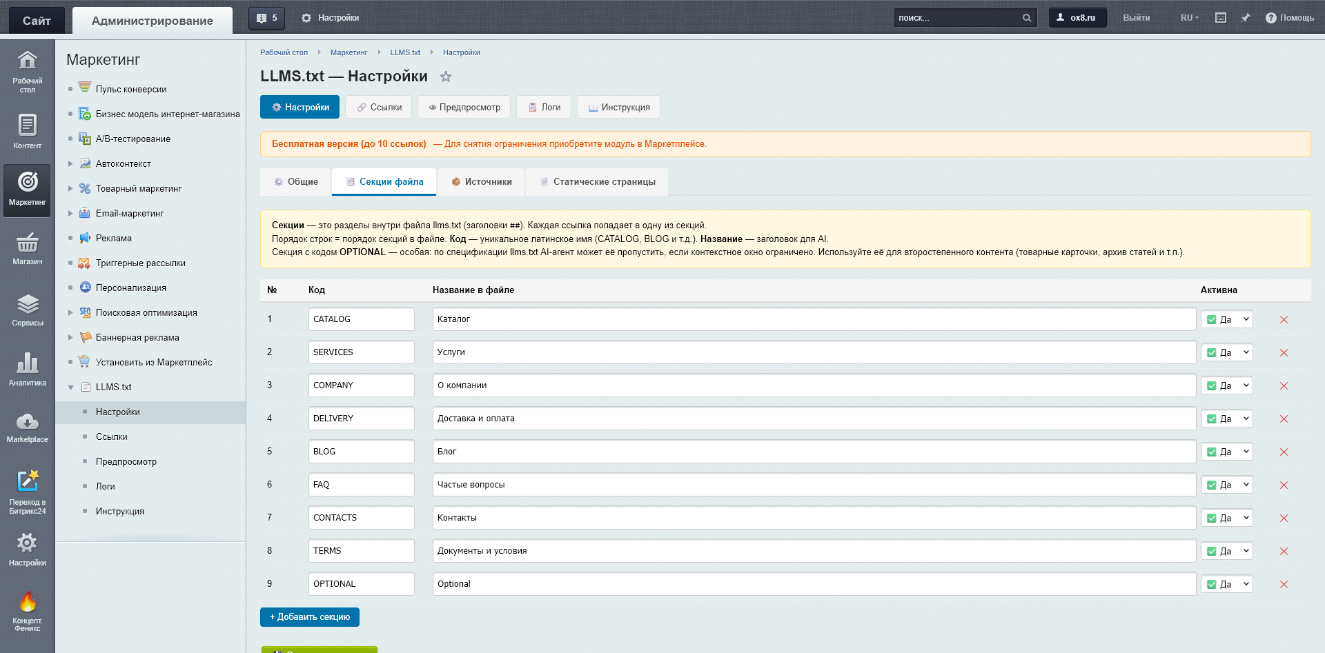 - Гибкая настройка структуры: маппинг контента по секциям (например, разделы каталога → “Каталог”, товары → “Optional”).