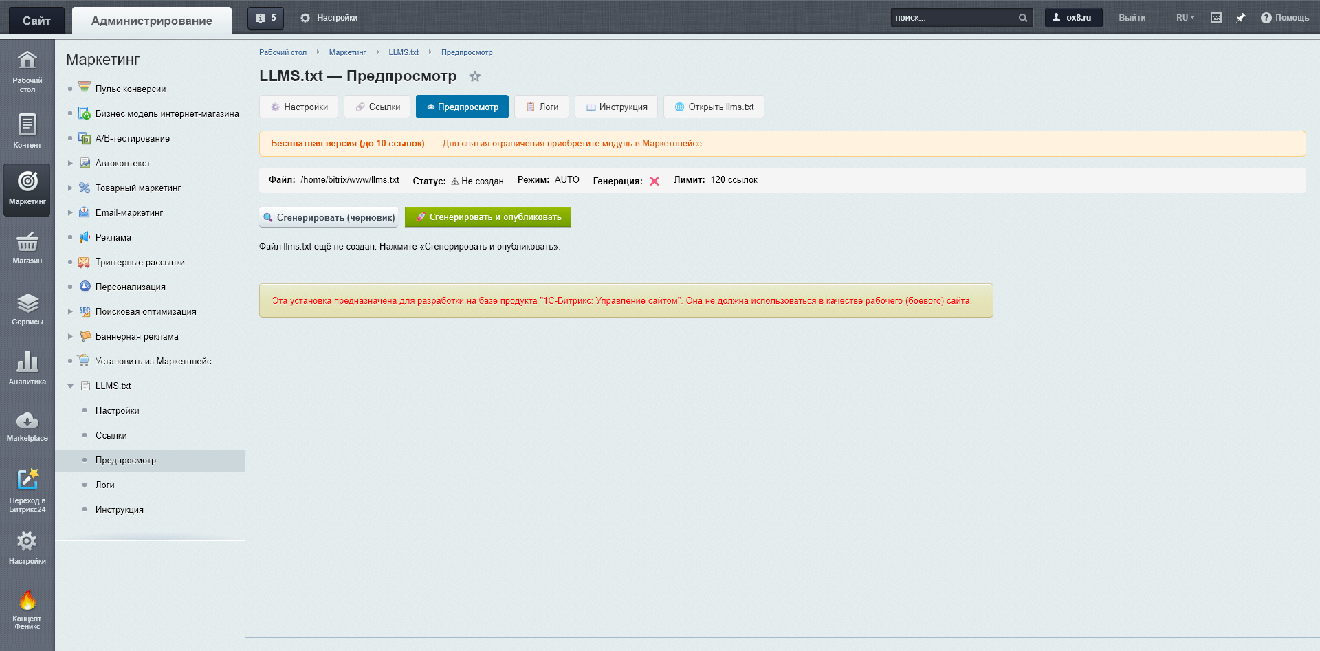 Модуль может использоваться как часть практик GEO (Generative Engine Optimization) — подготовки сайта к генеративным ответам AI-систем и AI-поиску. Он формирует курируемый llms.txt по спецификации, чтобы ключевые разделы сайта были описаны кратко и структурно.