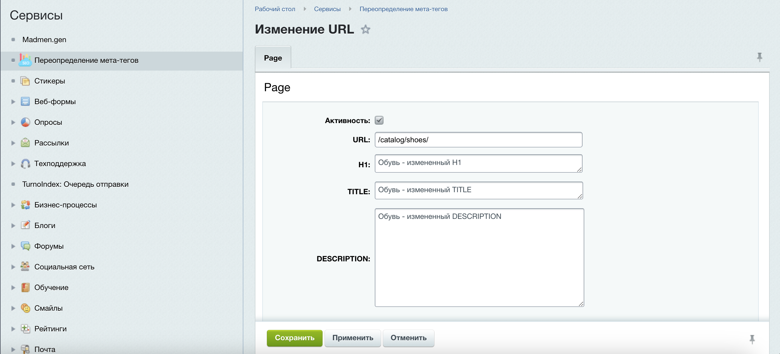 - Для любых страниц: стандартные средства Битрикса не всегда подходят для кастомных страниц. Наш модуль решает эту проблему, позволяя указать мета-теги и H1 для любых страниц, независимо от их структуры.