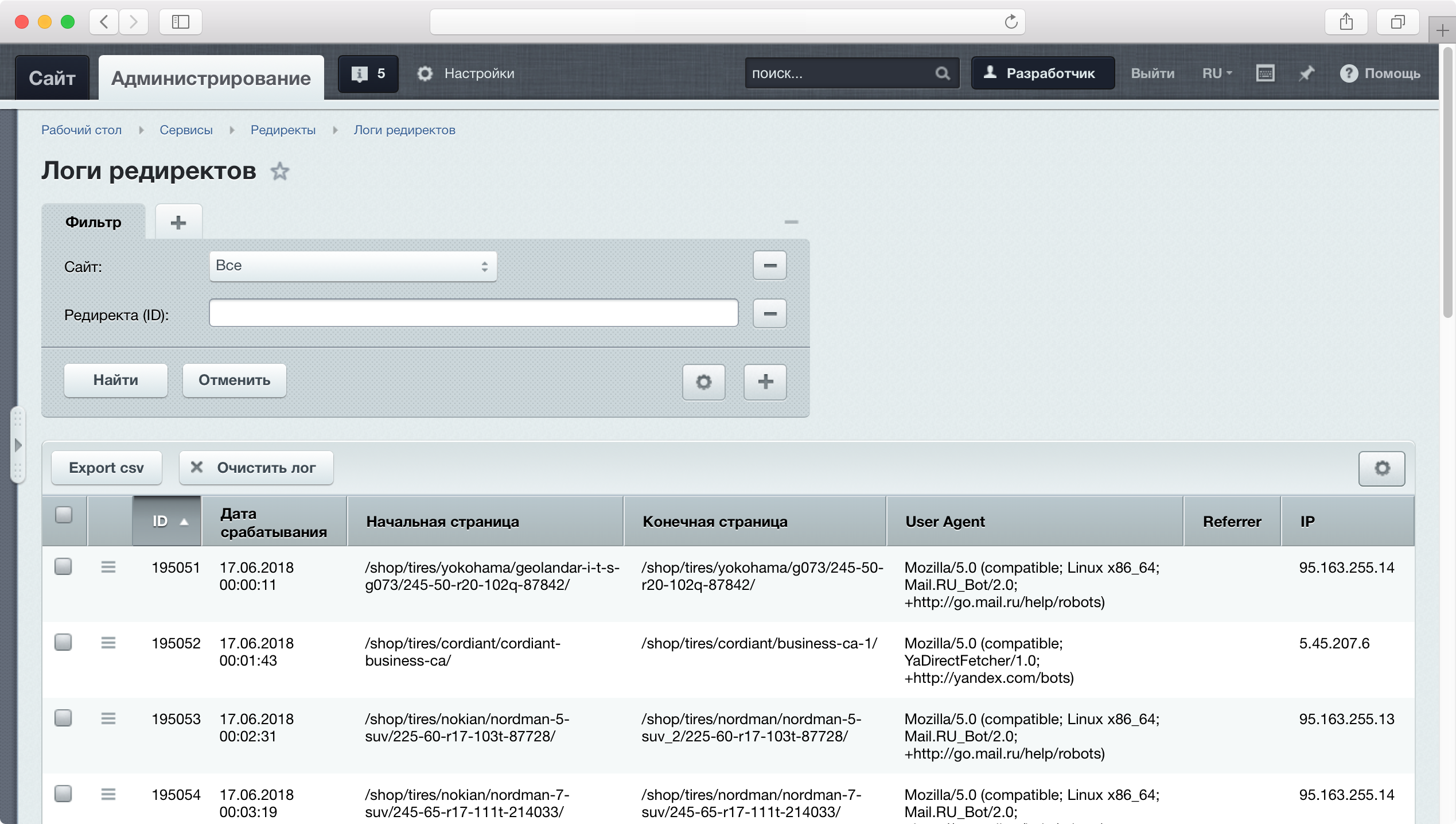 - Экспорт csv-файлов с правилами работающих редиректов;