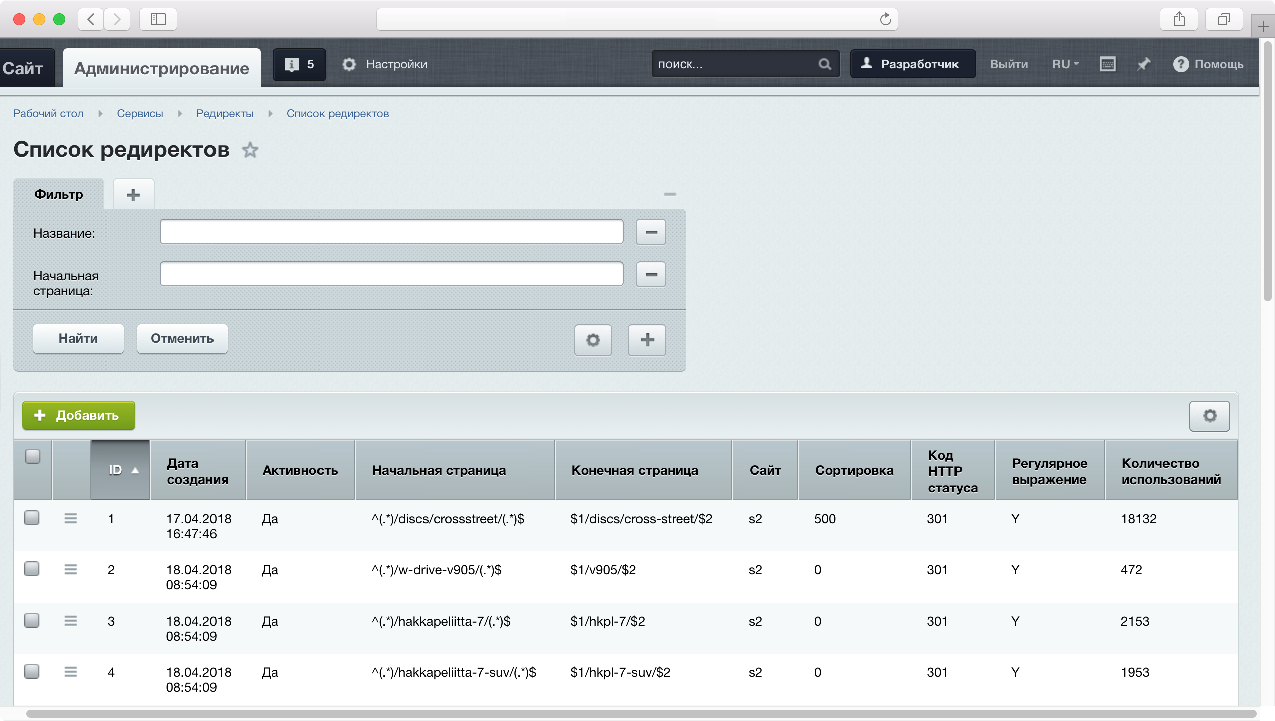- Создание 3XX редиректов из интерфейса модуля и возможность фильтрации добавленных правил;