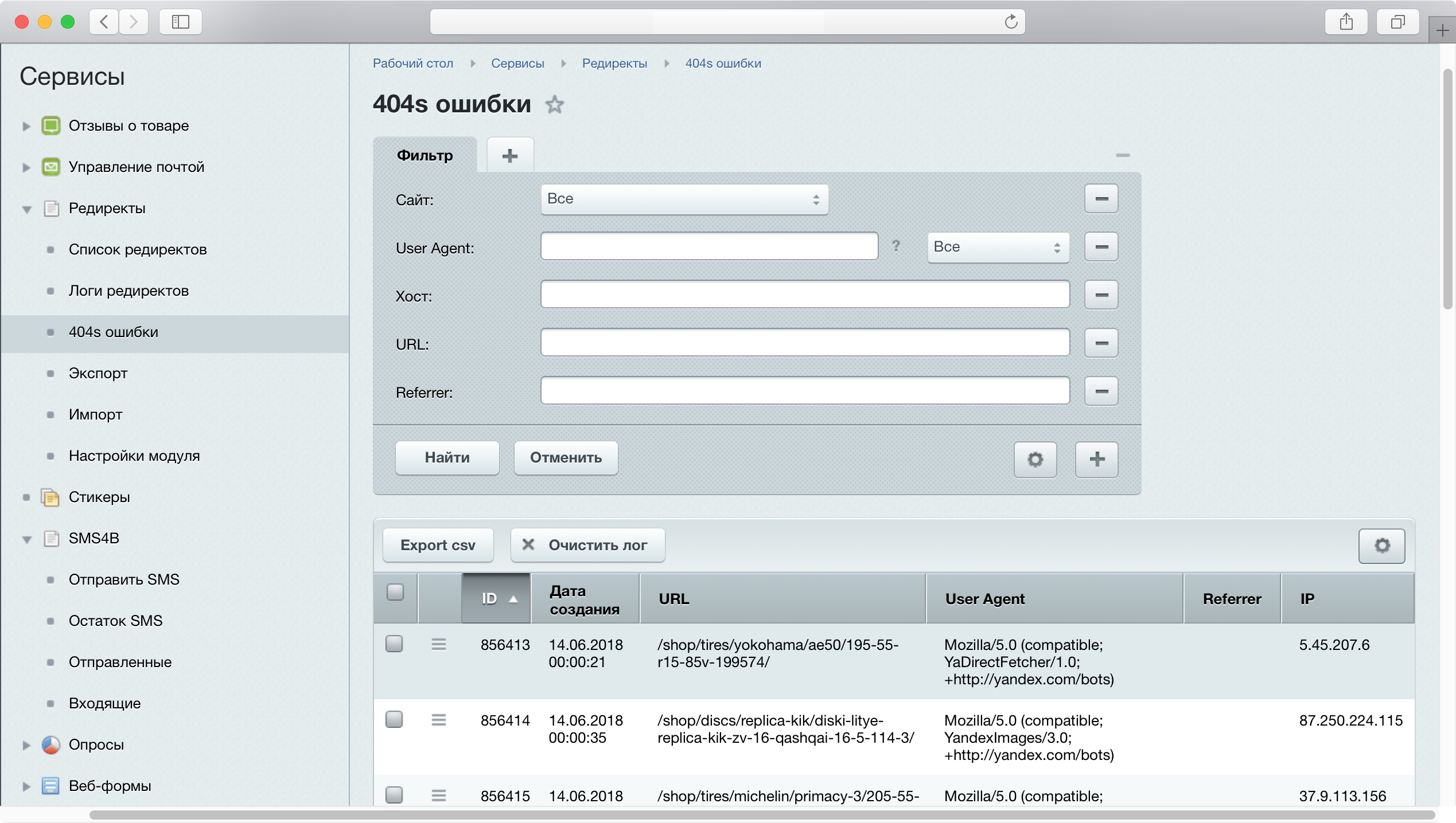 Модуль ведет сбор логов переадресаций и 404-ых ошибок с дополнительной информацией о посетителях и роботах. Данный лог можно выгрузить для дальнейшего анализа.