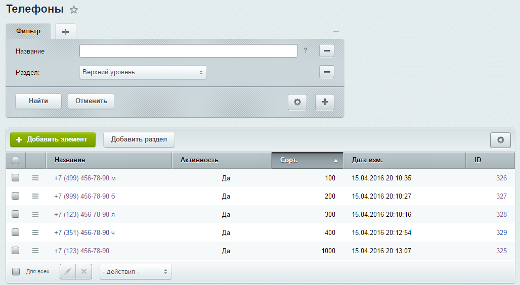 | Важно! Условия выполняются в порядке сортировки - от наименьшего веса к наибольшему. Номер телефона "по-умолчанию" (без условий) должен иметь наибольший вес в поле "Сортировка". |