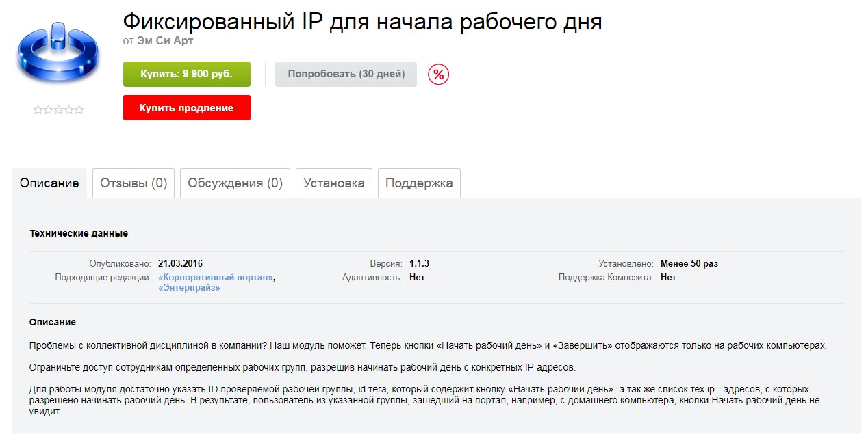 Для работы модуля достаточно указать ID проверяемой рабочей группы, id тега, который содержит кнопку «Начать рабочий день», а так же список тех ip - адресов, с которых разрешено начинать рабочий день. В результате, пользователь из указанной группы, зашедший на портал, например, с домашнего компьютера, кнопки Начать рабочий день не увидит.