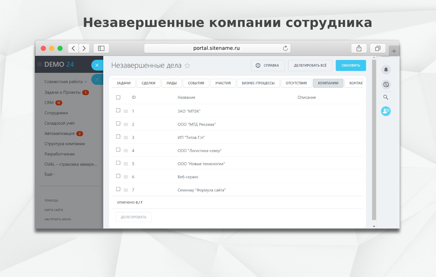 После завершения настройки модуля в профиле сотрудника появляется кнопка «Незавершенные дела». В слайдере можно просмотреть весь список дел сотрудника, сгруппированный по категориям. Если у задачи или события не оказалось ответственного, то руководитель может их делегировать прямо из модуля по отдельности, либо, выбрав все из одной или нескольких категорий.