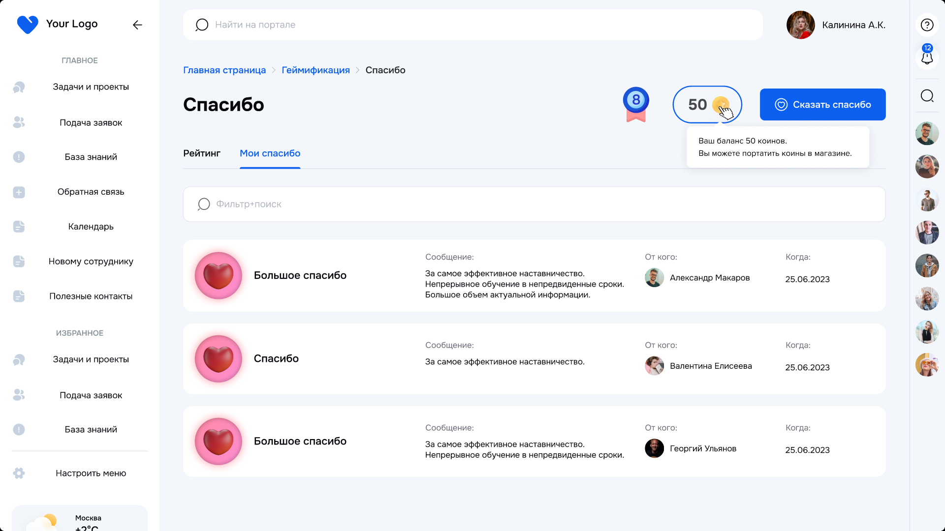 Наш сервис предлагает вам создать собственную экосистему достижений и поощрений, где сотрудники смогут получать ачивки, принимать и возвращать благодарности, копить «коины» (монеты) и извлекать ощутимую пользу из своей активности.
