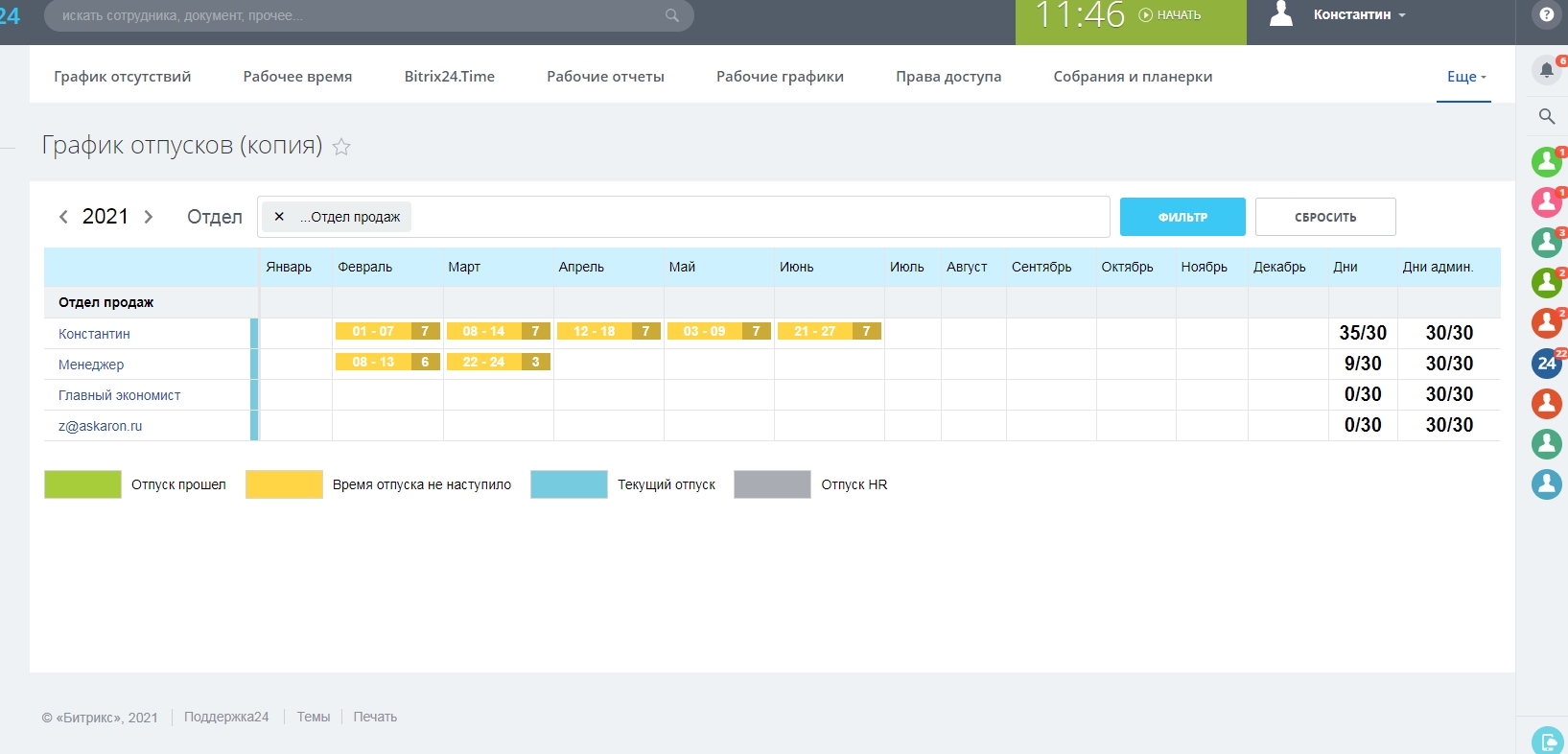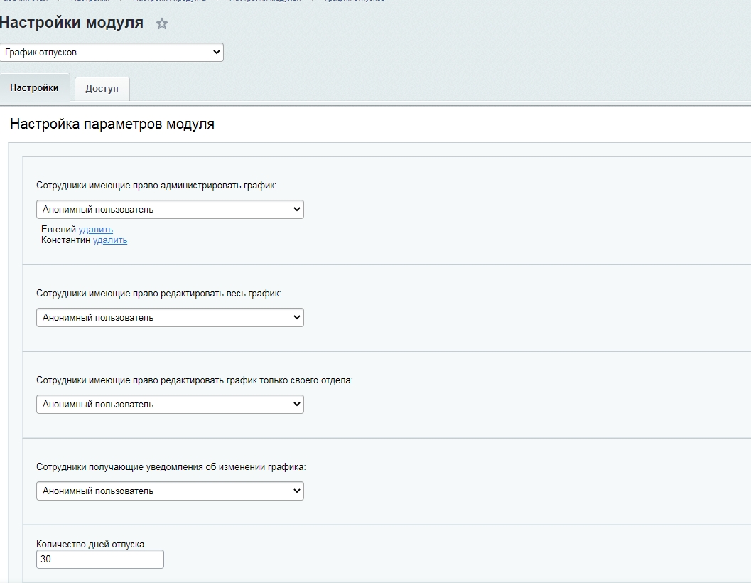 Модуль предназначен для планирования графика отпусков сотрудников компании.
