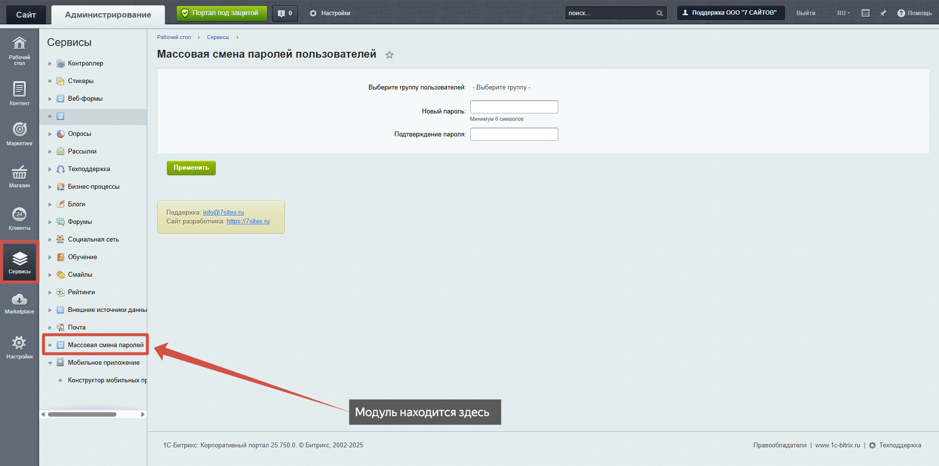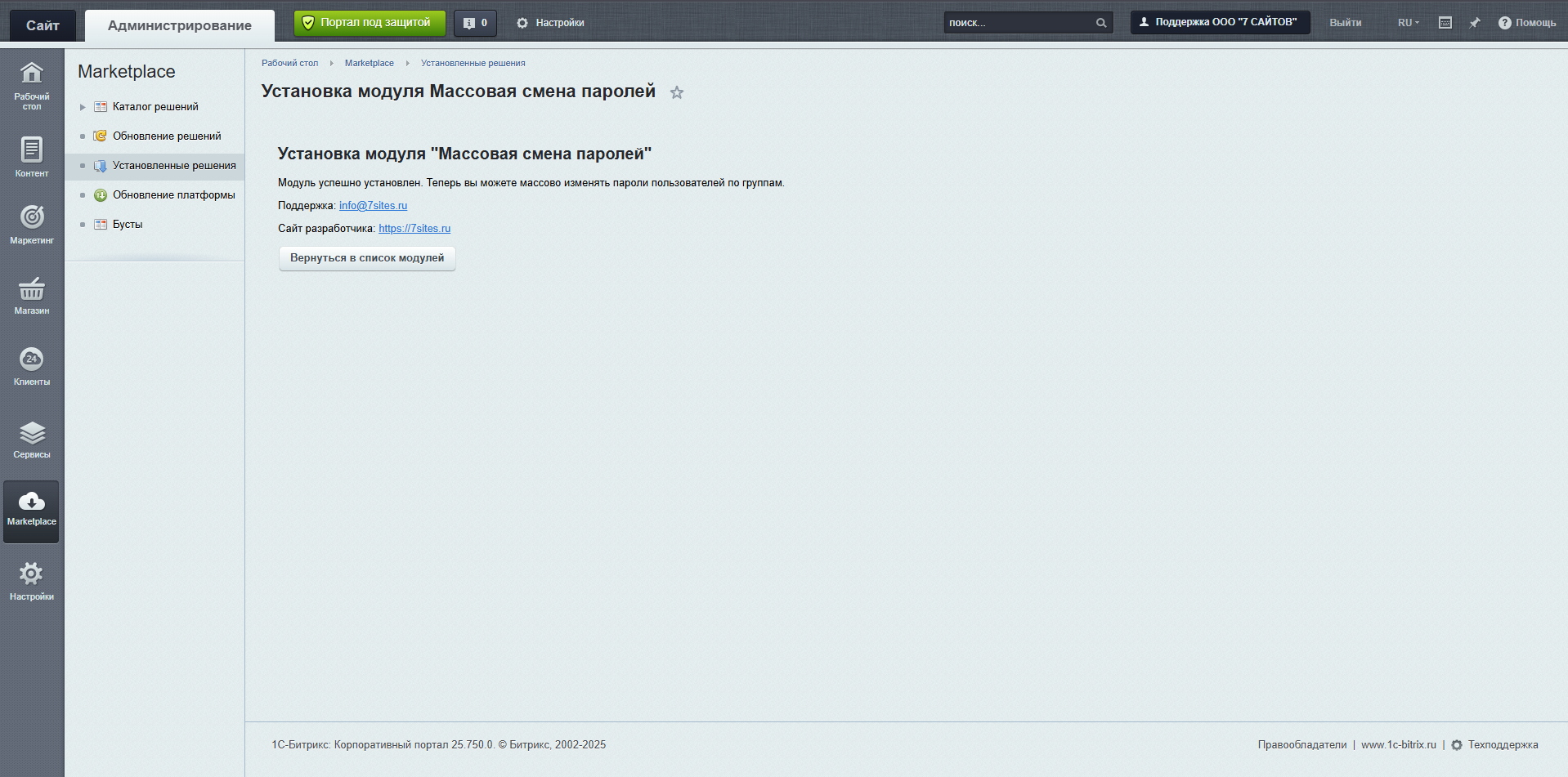 Модуль «Массовая смена паролей» предназначен для быстрого и безопасного изменения паролей у групп пользователей в коробочной версии Битрикс24 и Битрикс: Управление сайтом. Решение особенно востребовано при инцидентах безопасности, смене сотрудников или плановом обновлении паролей в организации.