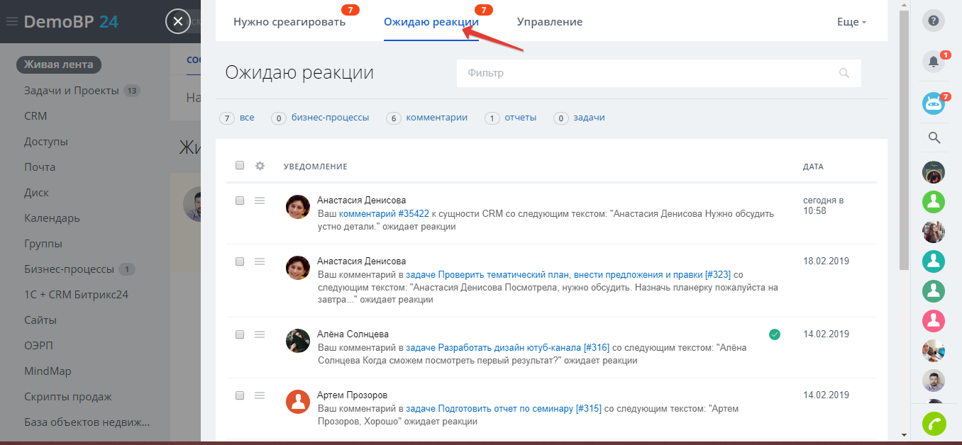 Помогает не упустить важное и вовремя отвечать на вопросы коллег по задачам, сделкам, сообщениям и другим сущностям Битрикс24.