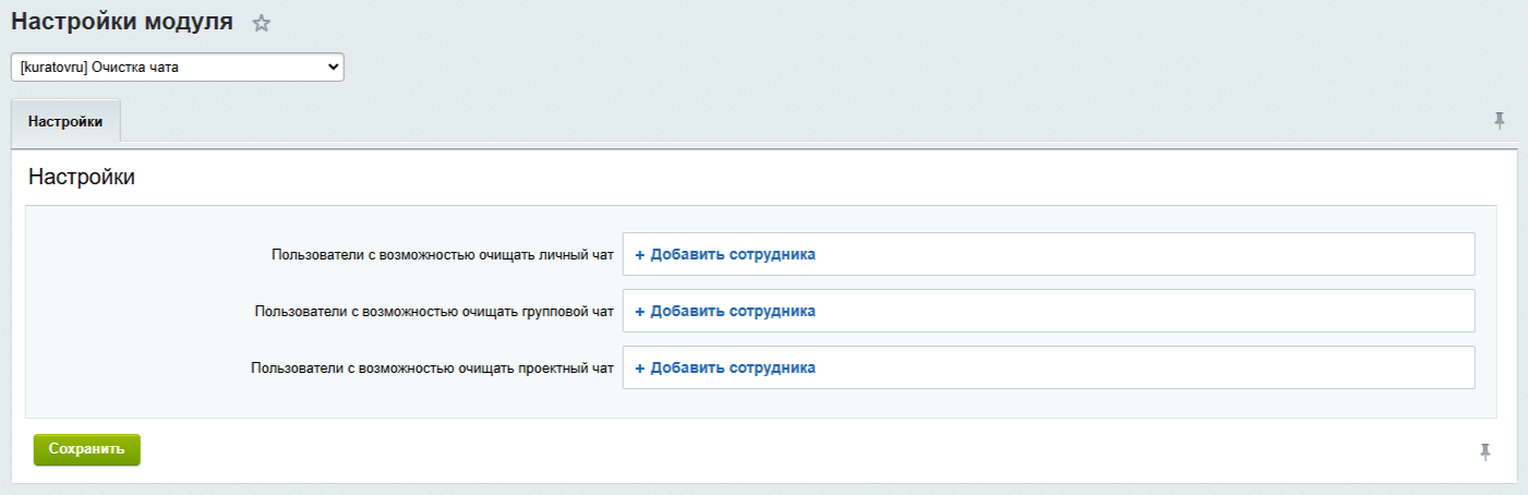 Модуль позволяет настроить для определенных сотрудников вывод кнопки, для удаления всех сообщений чата и вложений, в том числе чатов с уволенными сотрудниками